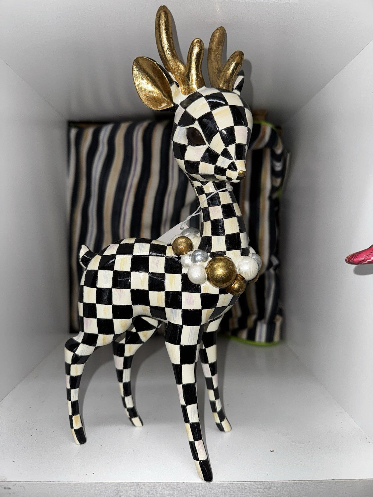 The Mackenzie Childs Courtly Check Gold Dear Deer figurine is a stylish addition to your holiday décor collection. Standing at 11.75 inches tall and crafted from resin, this black, white, and silver piece features a unique Courtly Check pattern with a golden deer design. Perfect for Christmas and featuring a free-standing mounting, this figurine brings a touch of elegance to any space with its intricate detailing and charming character. Made in China, this figurine is a must-have for those who appreciate high-quality design and festive accents.