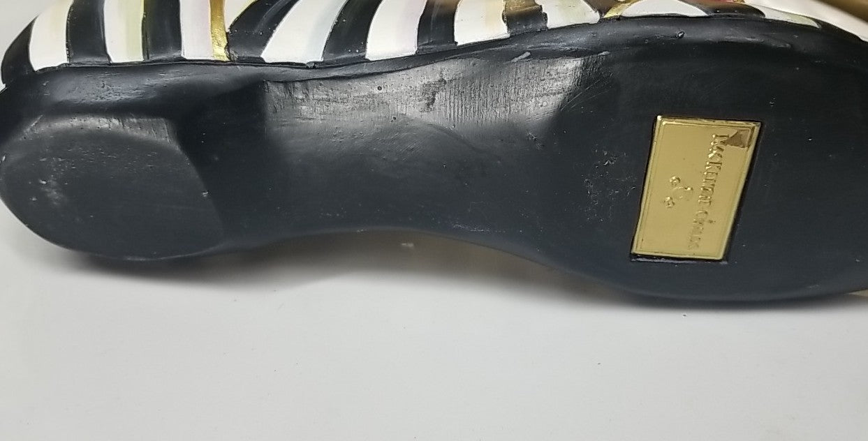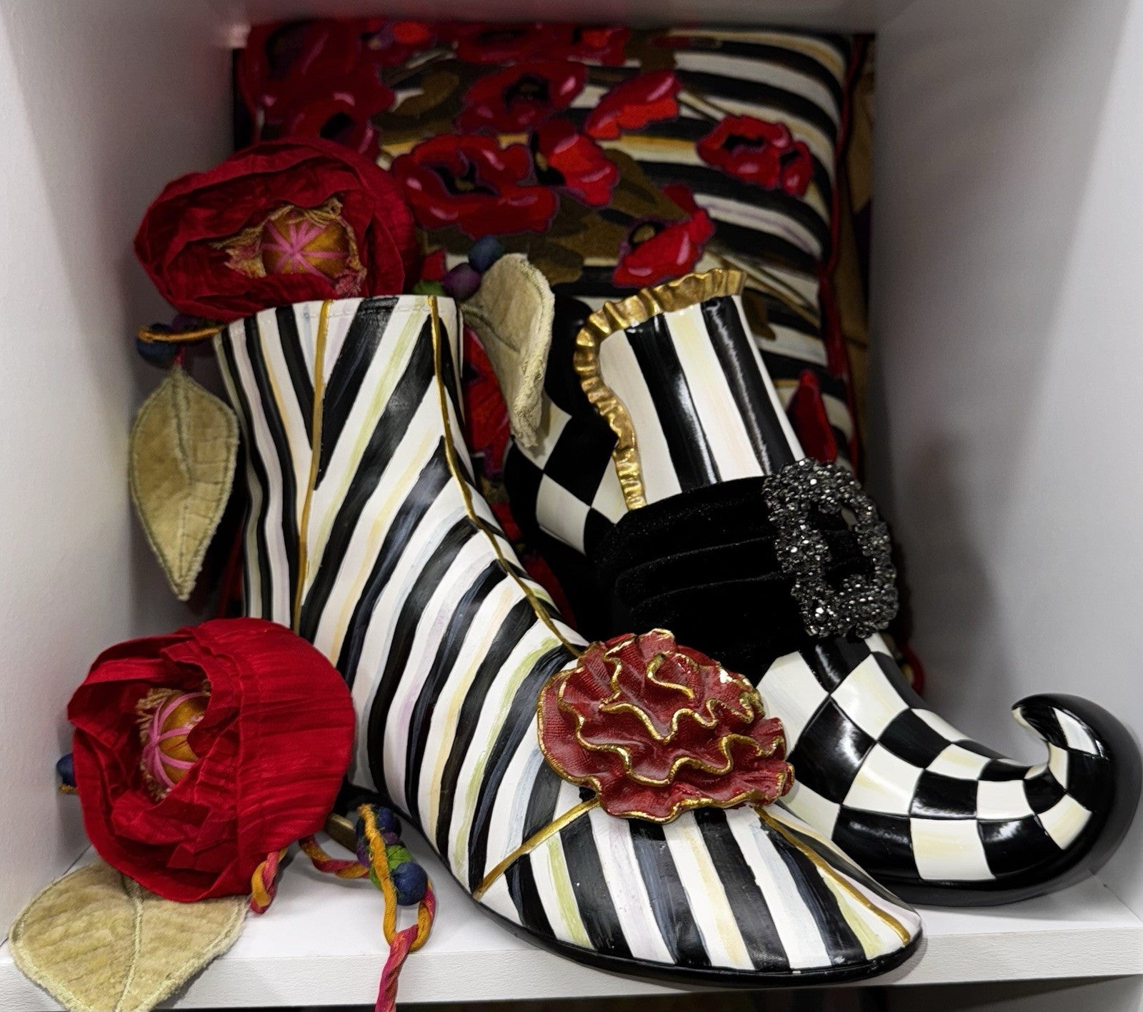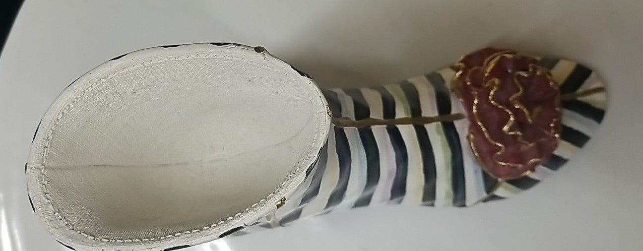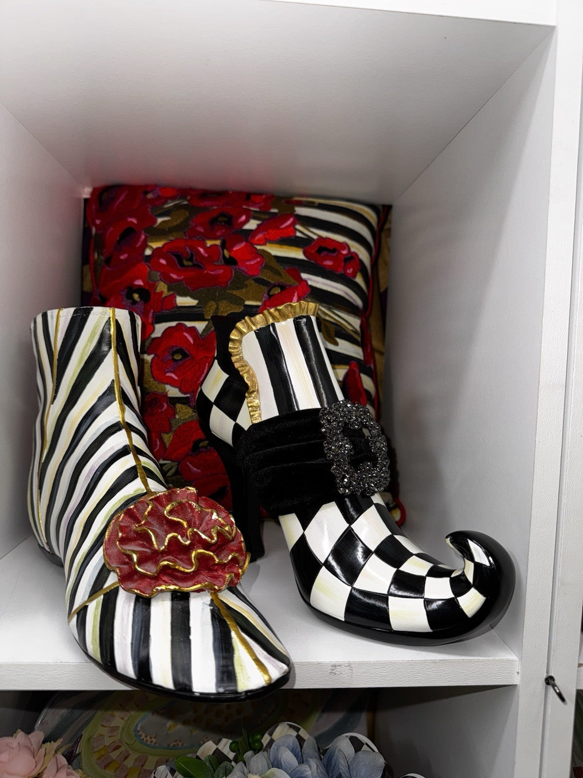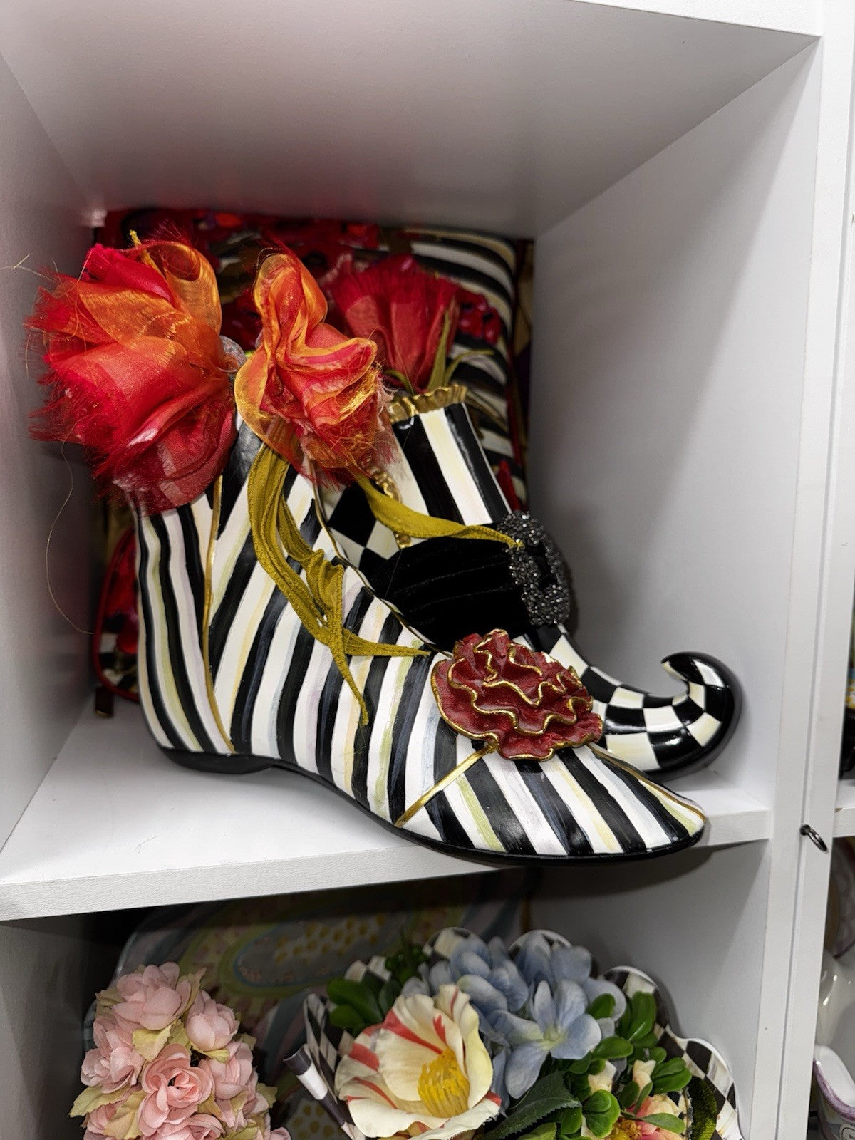 The Mackenzie Childs Courtly Stripe Shoe Vase with a red flower is a retired collectible piece that adds a touch of floral charm to any room. Made from mixed materials and resin, this medium-sized shoe vase features a classic black, white, and red color scheme that is perfect for all occasions. With its unique design and vintage appeal, this MacKenzie-Childs creation is a stylish and whimsical addition to any collection or decor.