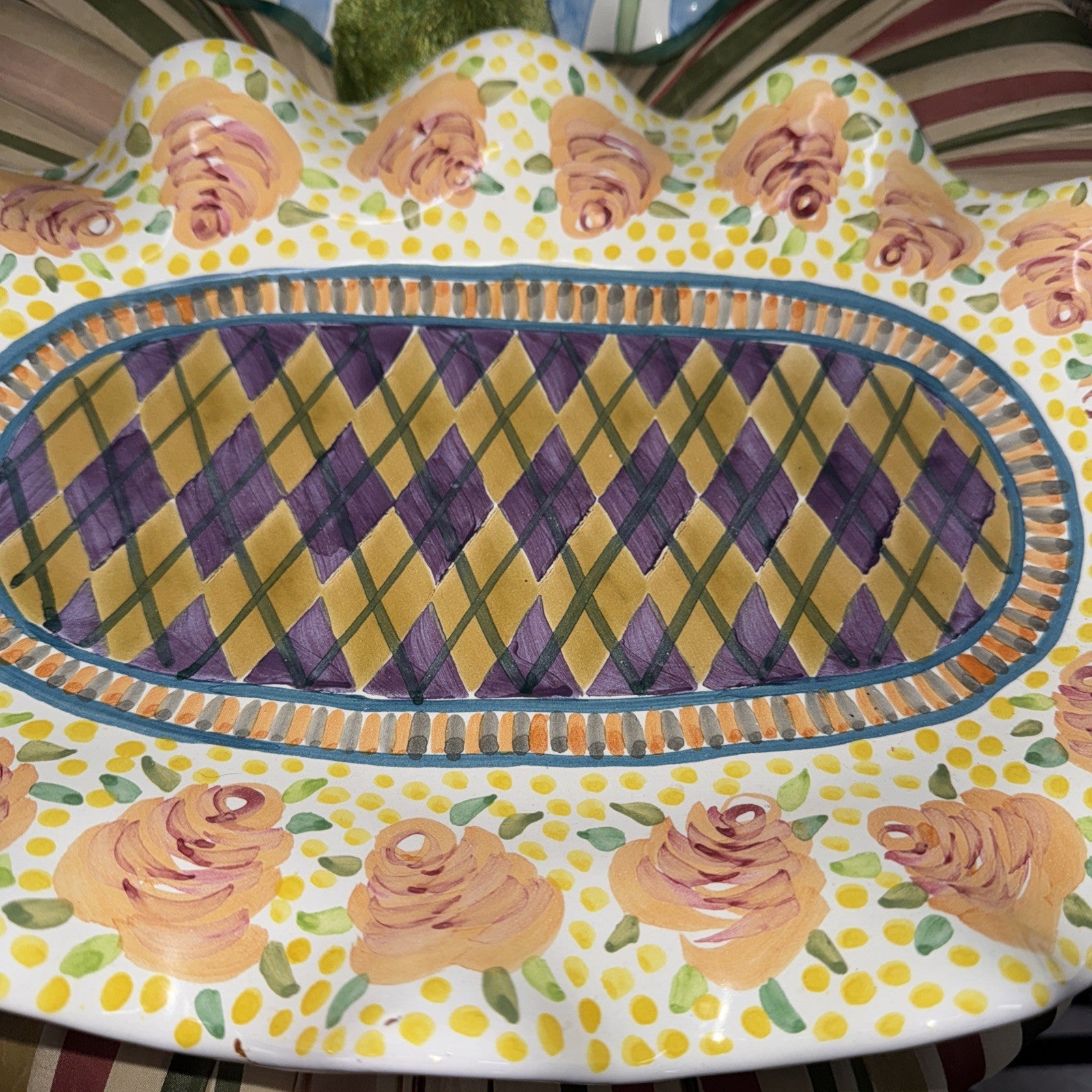 an AUTHENTIC RARE MACKENZIE CHILDS oval odd fellows is NO LONGER AVAILABLE. This is ceramic and HANDMADE in Aurora, NY and HAND-PAINTED. This was purchased directly from Mackenzie Childs. CLASSIC and WONDERFUL addition to any table or use as a display for candles or charcuterie or whatever you desire!! The platter is fluted/ruffled and measures approximately 16"L by 10 1/2"W. Hand washing is recommended. This is individually handmade and hand-painted...thus, no two are exactly alike. Pictures of actual item