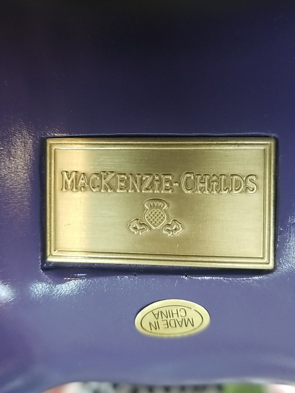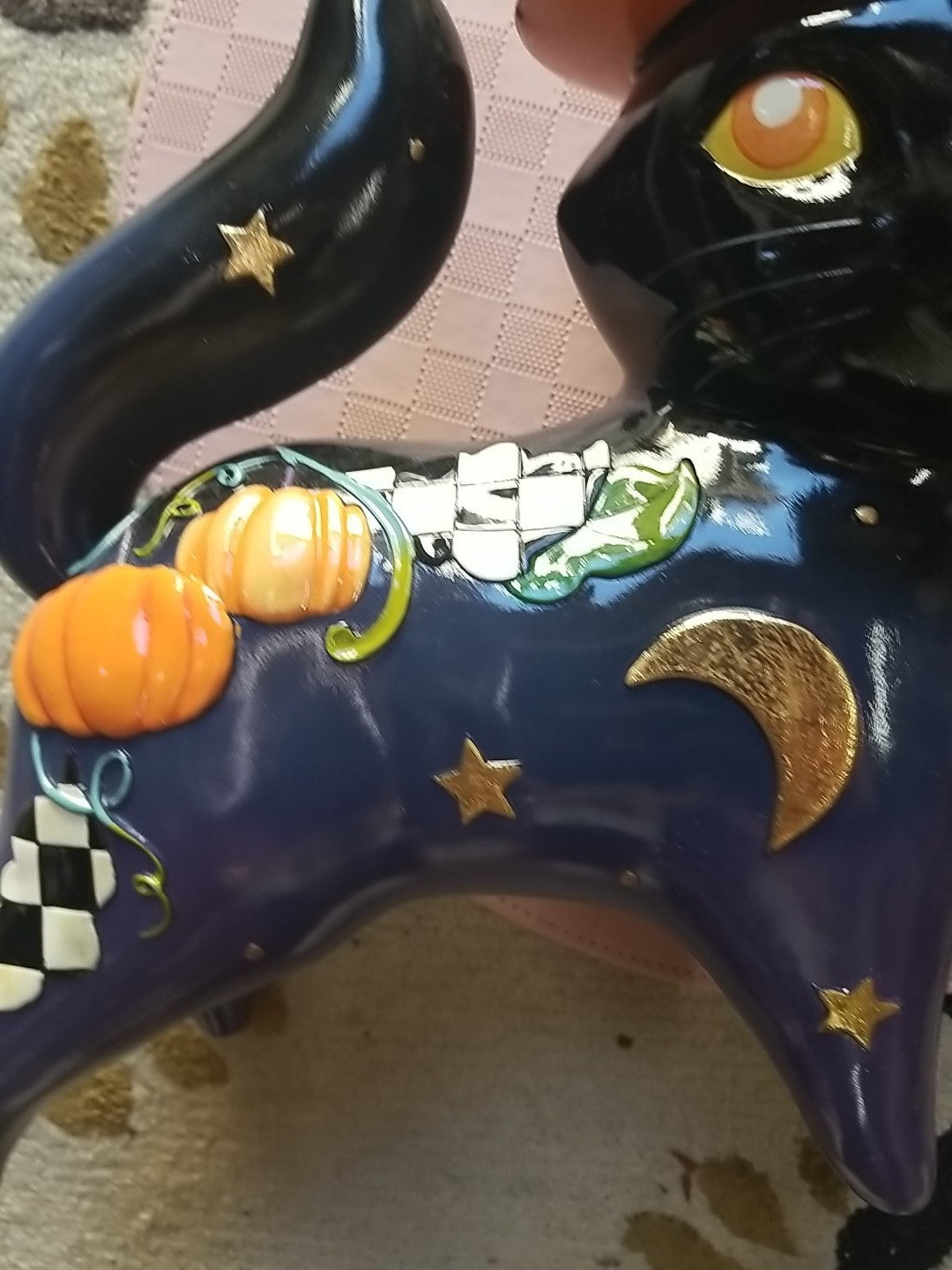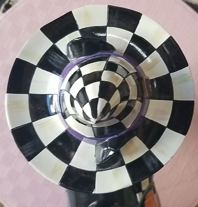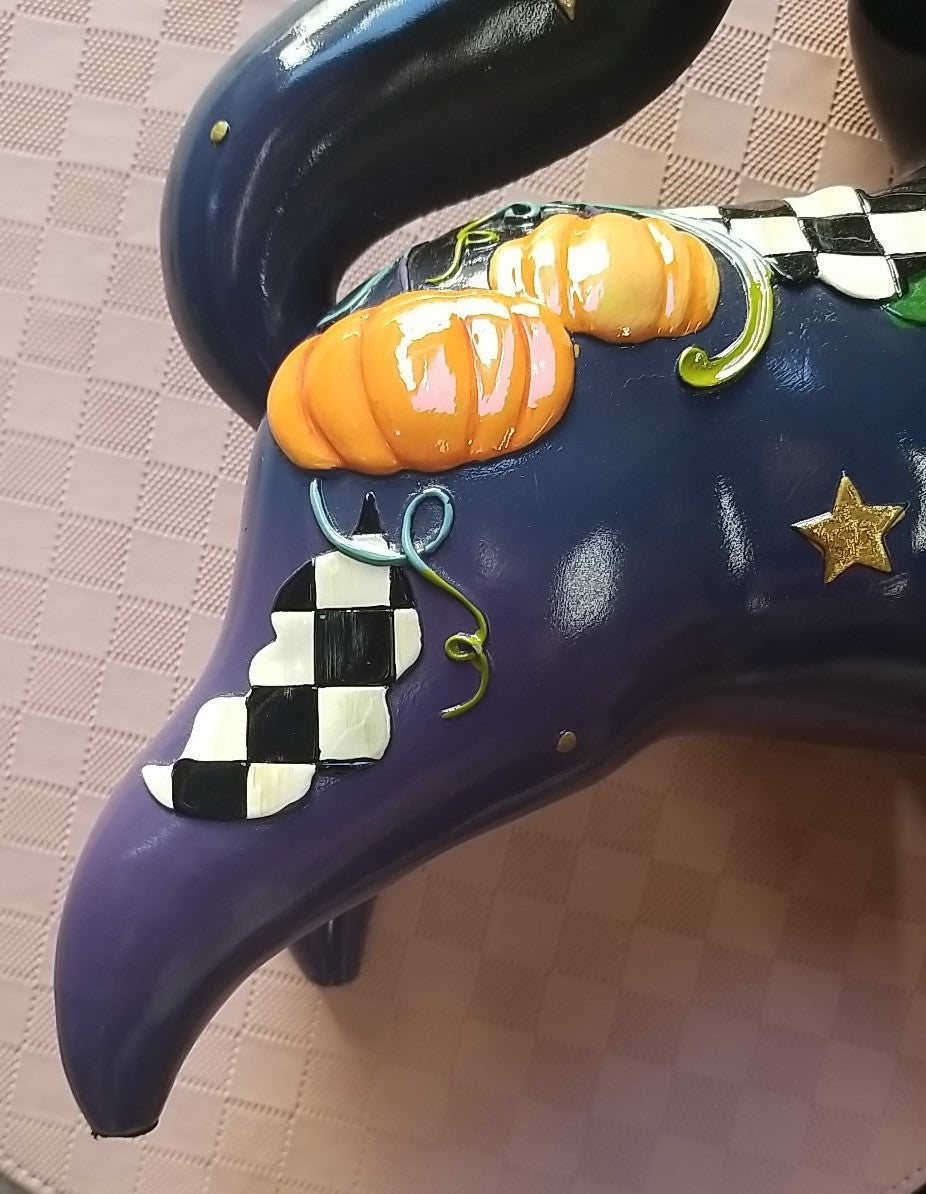 The Mackenzie Childs Halloween FORTUNE Teller BLACK CAT 13" Courtly Check Figure is a whimsical and stylish figurine perfect for adding a touch of Halloween magic to your home décor. Standing at 13.5 inches tall, this resin cat features a purple, black, gold, and orange color scheme in the iconic MacKenzie-Childs Courtly Check pattern. Its Halloween theme and fortune teller design make it a fun and eye-catching addition to your seasonal decorations.