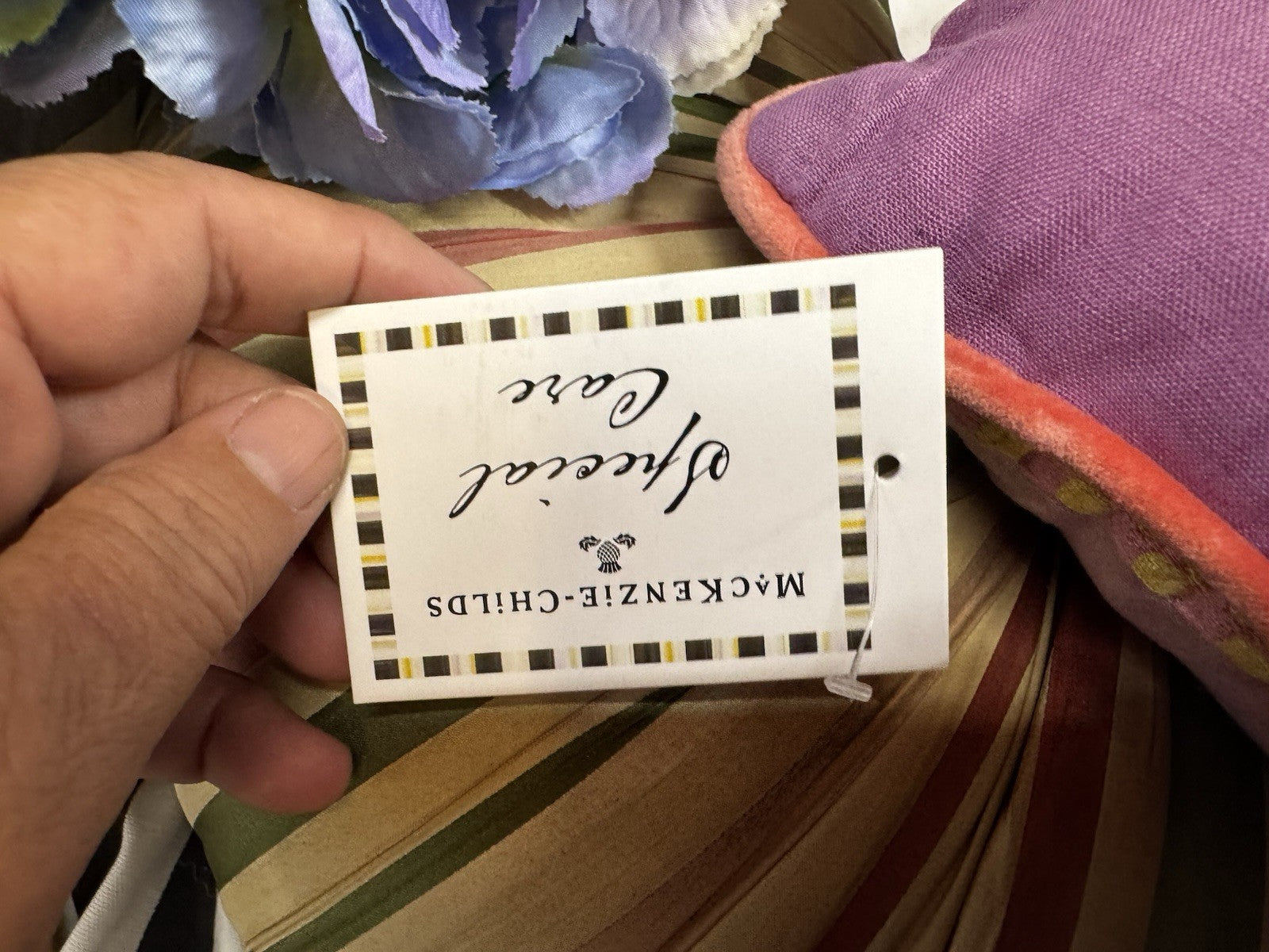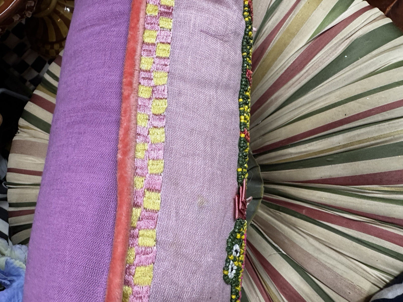 Patience Brewster's Gloria Alligator is a tribute to humor, to kicking up your heels, and to grinning, no matter what. The Patience Brewster Gloria Alligator Lumbar Pillow is embellished with beading, embroidery, tiny sequins, and a bit of grosgrain ribbon on a background of cotton linen.