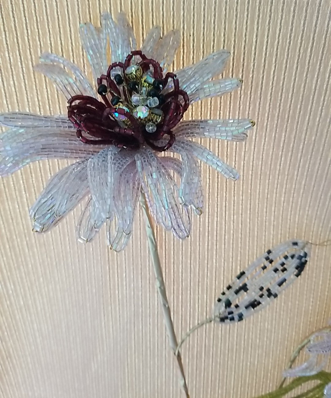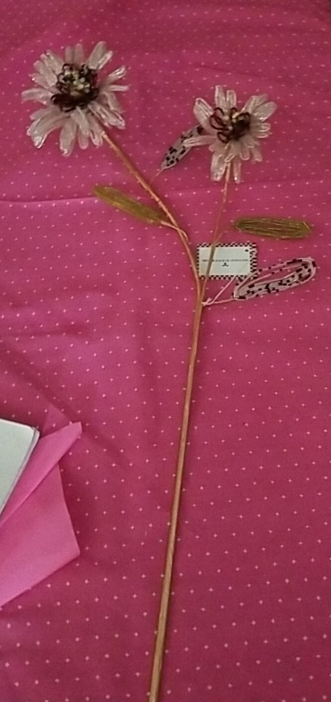 This product is a MacKenzie-Childs Pink Beaded Flower Stem measuring 23 inches in height. It features a beaded design and is made of both beads and wire. The item is a beaded flower pick that can be used for floral decor in a home or garden setting. It is brand new with tags attached, making it a fresh and stylish addition to any floral arrangement.