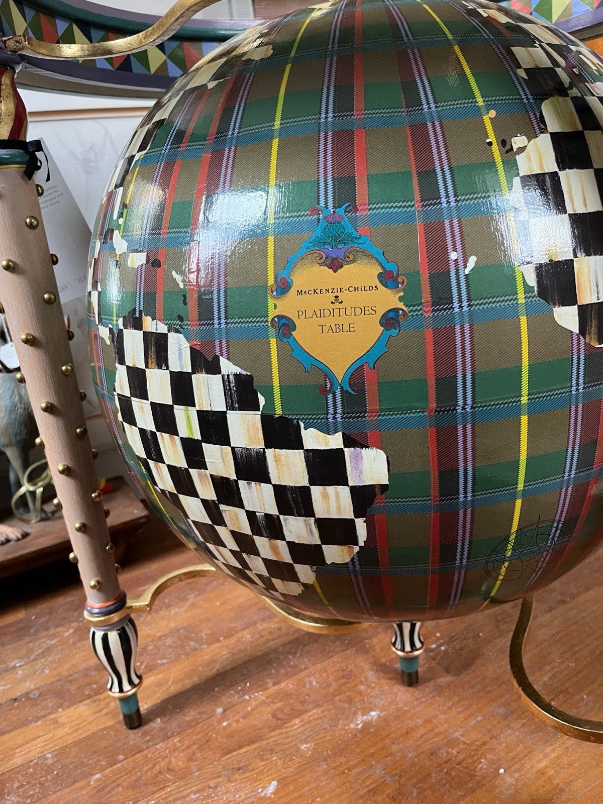 Gmelina solids and maple veneer. Hand decorated in Courtly Stripes, gold leaf and brass dots. Rotating polyresin globe decoupaged with tartan and Courtly Check decals. Pieces may vary due to the handmade nature of each product. Imported frame. Hand-painted in Aurora NY.