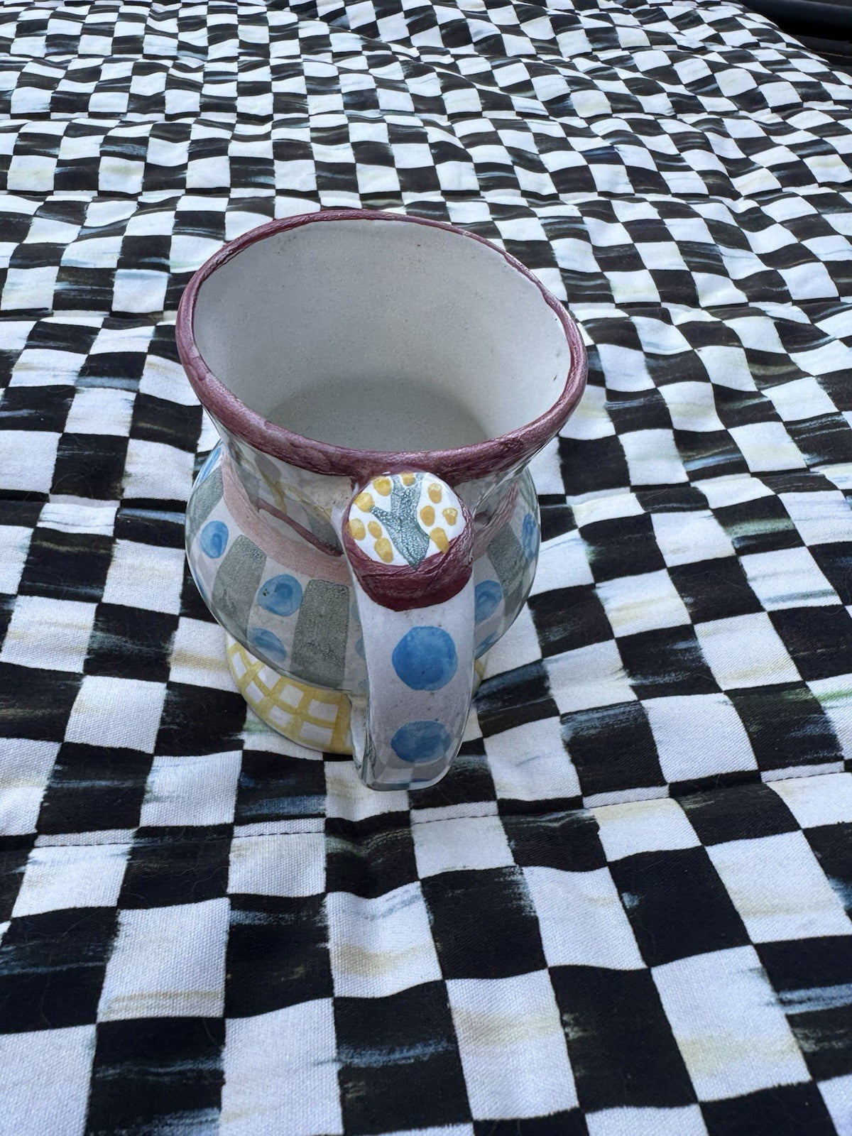 The Mackenzie Childs Pottery Coffee Mug is a beautifully crafted 5" mug with a thumb rest, featuring a charming pattern in vibrant multicolor.