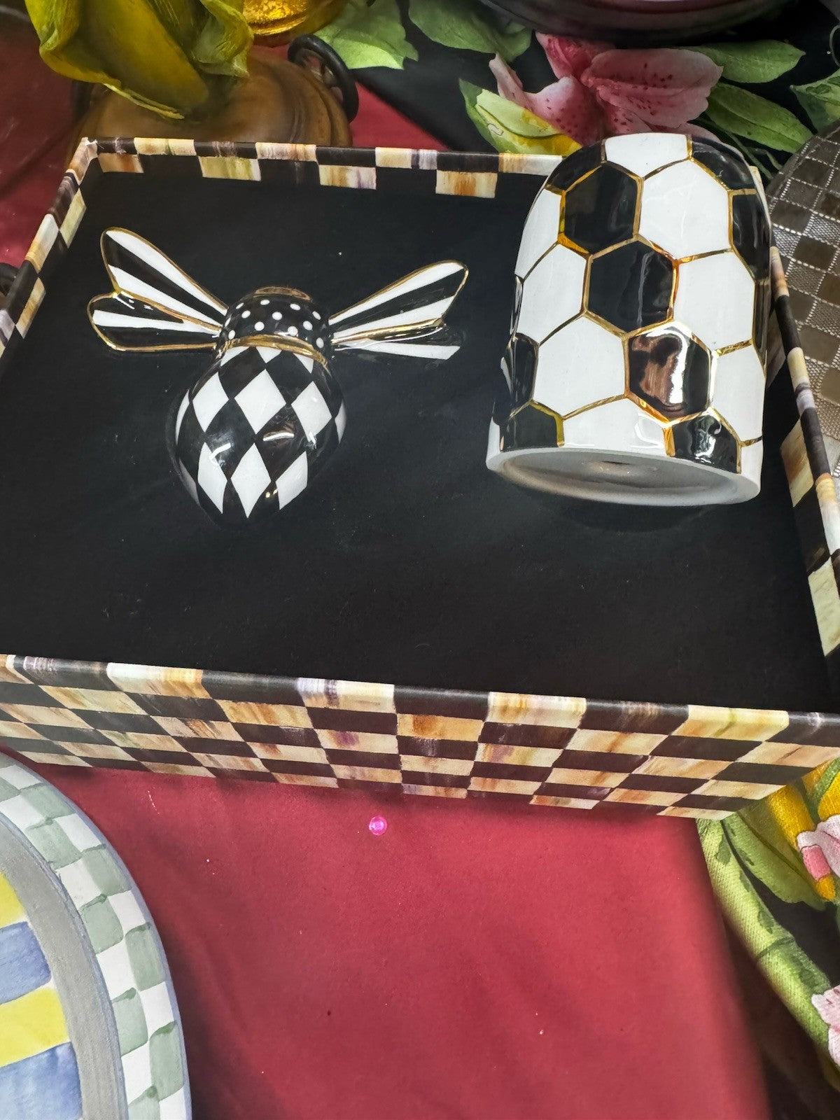 MacKenzie-Childs' two-piece ceramic, hand-painted Queen Bee Hostess Set consists of a hive-pattern toothpick holder, paired with a bee that is a napkin weight. Presented in a gift box, it's the perfect present when you want to say, "Thanks for the invite." Dimensions: Set includes: 1 Bee napkin weight, 4" wide, 3.5 " long. 1 Hive toothpick holder, 2.5" in diameter and 3" tall. Materials: Ceramic Care & Use: Hand-wash only Pieces may vary due to the handmade nature of each product.