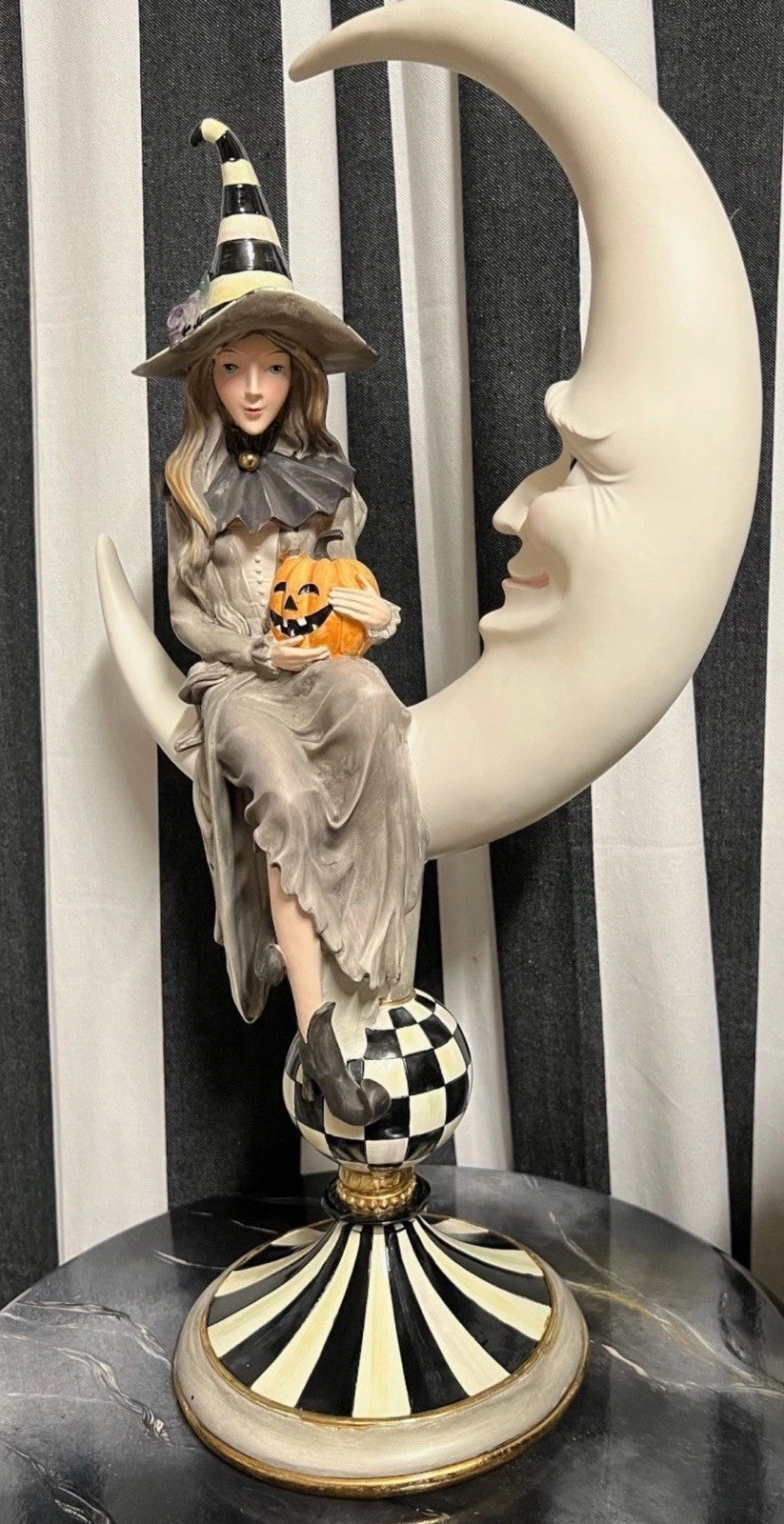 The MacKenzie-Childs Spellbound Witch & Moon Figure is a whimsical and colorful collectible perfect for Halloween. Standing at 21 inches tall, this resin figure features a multicolor design that will add a touch of magic to any holiday or seasonal décor. The brand's reputation for quality craftsmanship is evident in this charming and detailed piece, making it a must-have for fans of Mackenzie-Childs and Halloween enthusiasts alike.