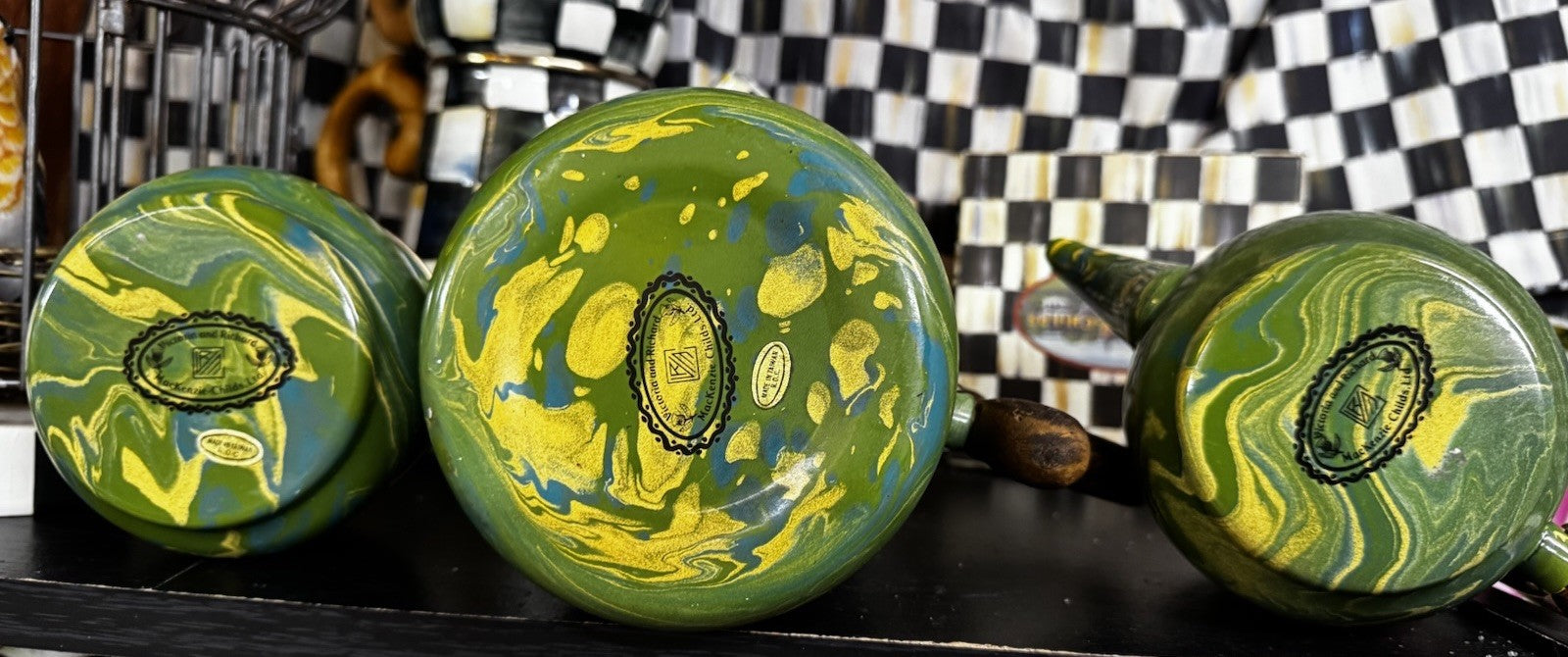 All three pieces when stacked are 14" tall x 10" wide. 5" deep. Teapot holds 4 cups & measures 9" x 10". Cream & sugar are approximately 4" x 6".