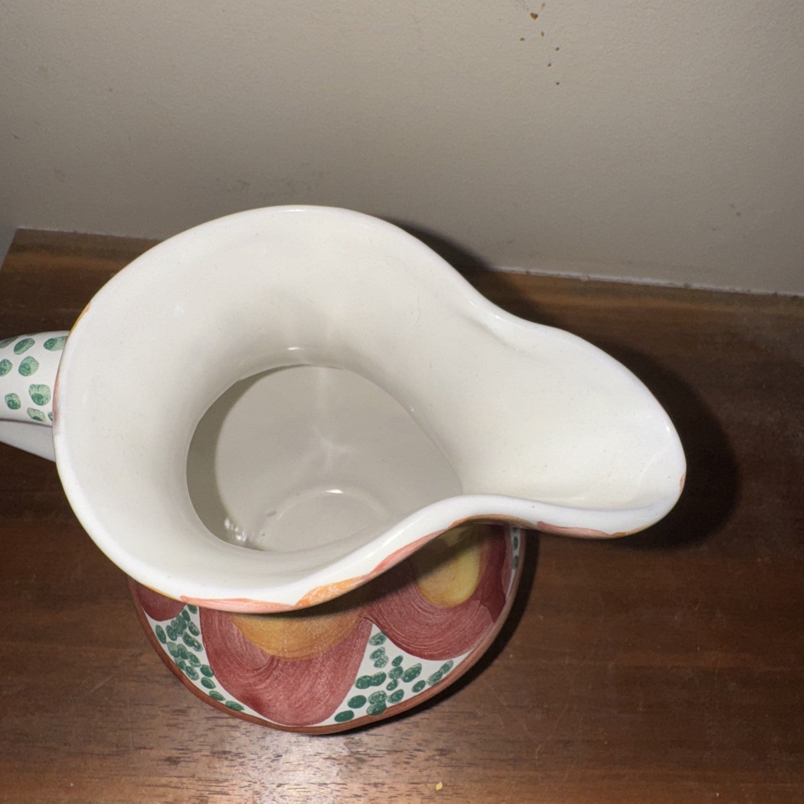 The Mackenzie Childs Taylor Kukenhoff Ceramic 5" Tall Creamer in Bright Colors is a hand-painted, glossy creamer featuring vibrant multicolor designs. Made by MacKenzie-Childs in the United States, this unique piece is part of the Kukenhoff product line and showcases the art pottery production style. The creamer stands at 5 inches tall and is adorned with an impressed backstamp, making it a standout addition to any kitchen or dining table. Made of ceramic, this one-of-a-kind creamer is a charming and functional piece for serving cream or milk with a touch of artistic flair.