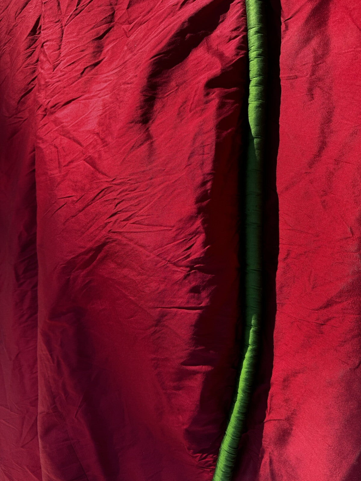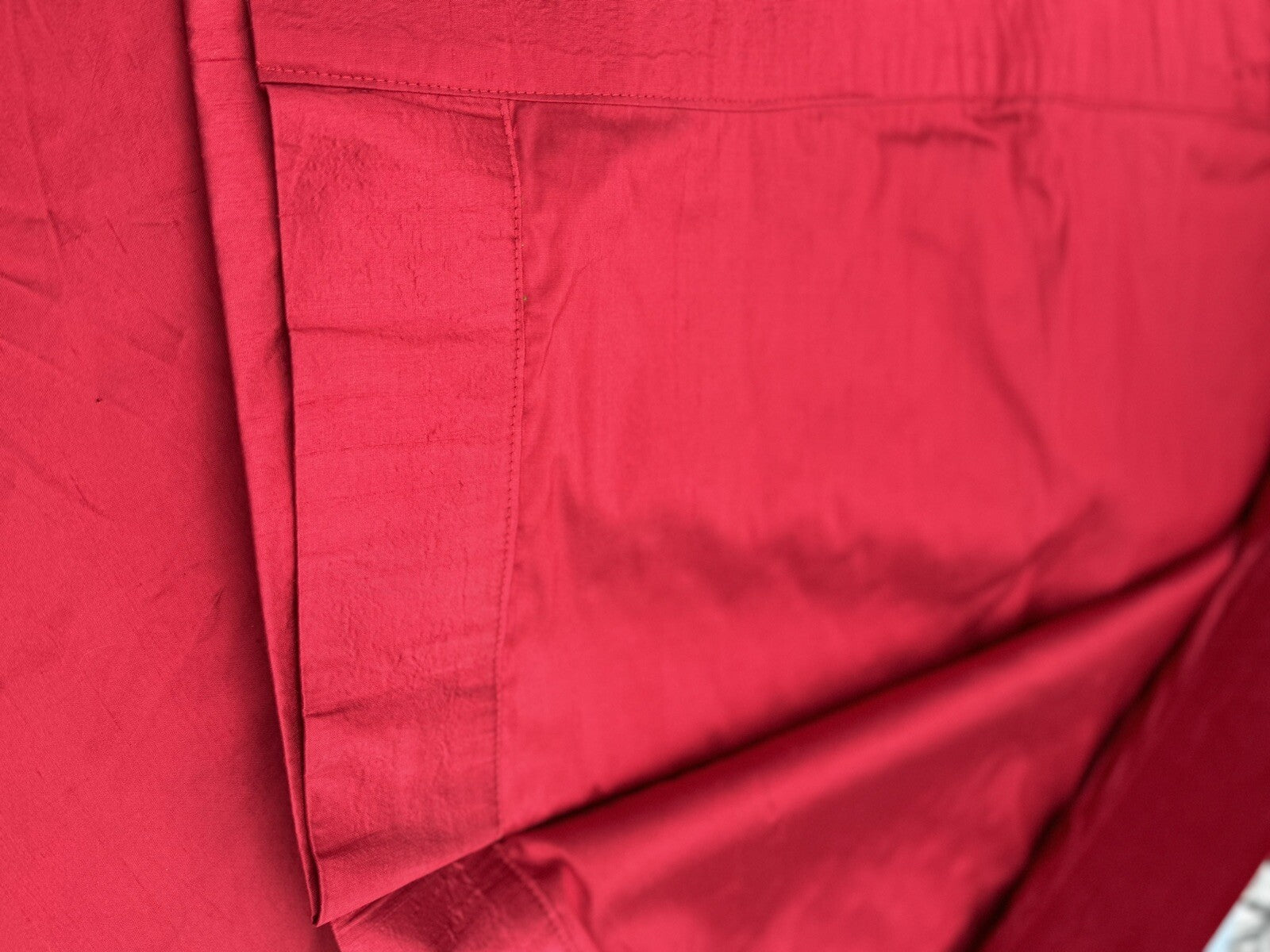 Add a touch of elegance to your dining table with this beautiful MacKenzie-Childs Hollies Berry tablecloth. The round tablecloth measures 90 inches in diameter and is made of 100% silk material. The red and green trim adds a pop of color to your table setting and complements any decor.