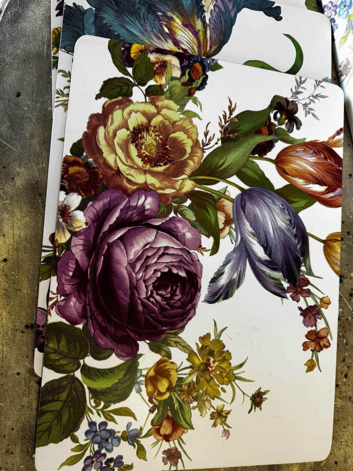 here is a set of Mackenzie Childs white Flower Market placemats with cork backing. Each measures 15 3/4" x 11 1/2". All are in excellent condition