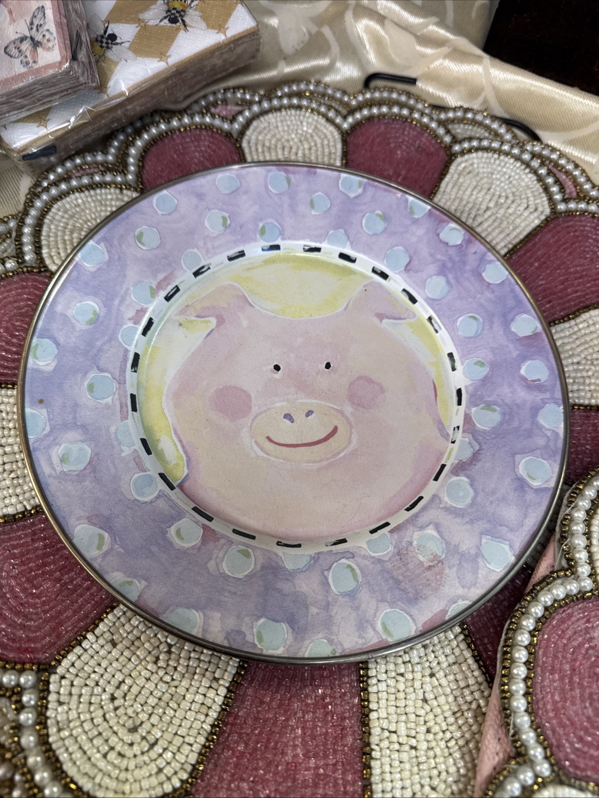 Vintage Mackenzie-Childs Pig Enamelware Metal Rim Childs Plate Retired 8”