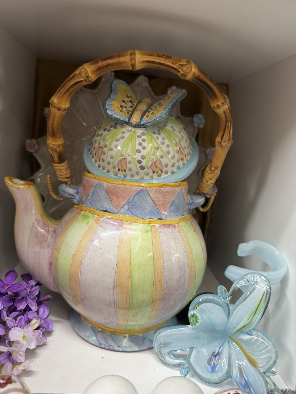 Mackenzie Childs Ceramic Butterfly Collection With Bamboo Handle Teapot 2006
