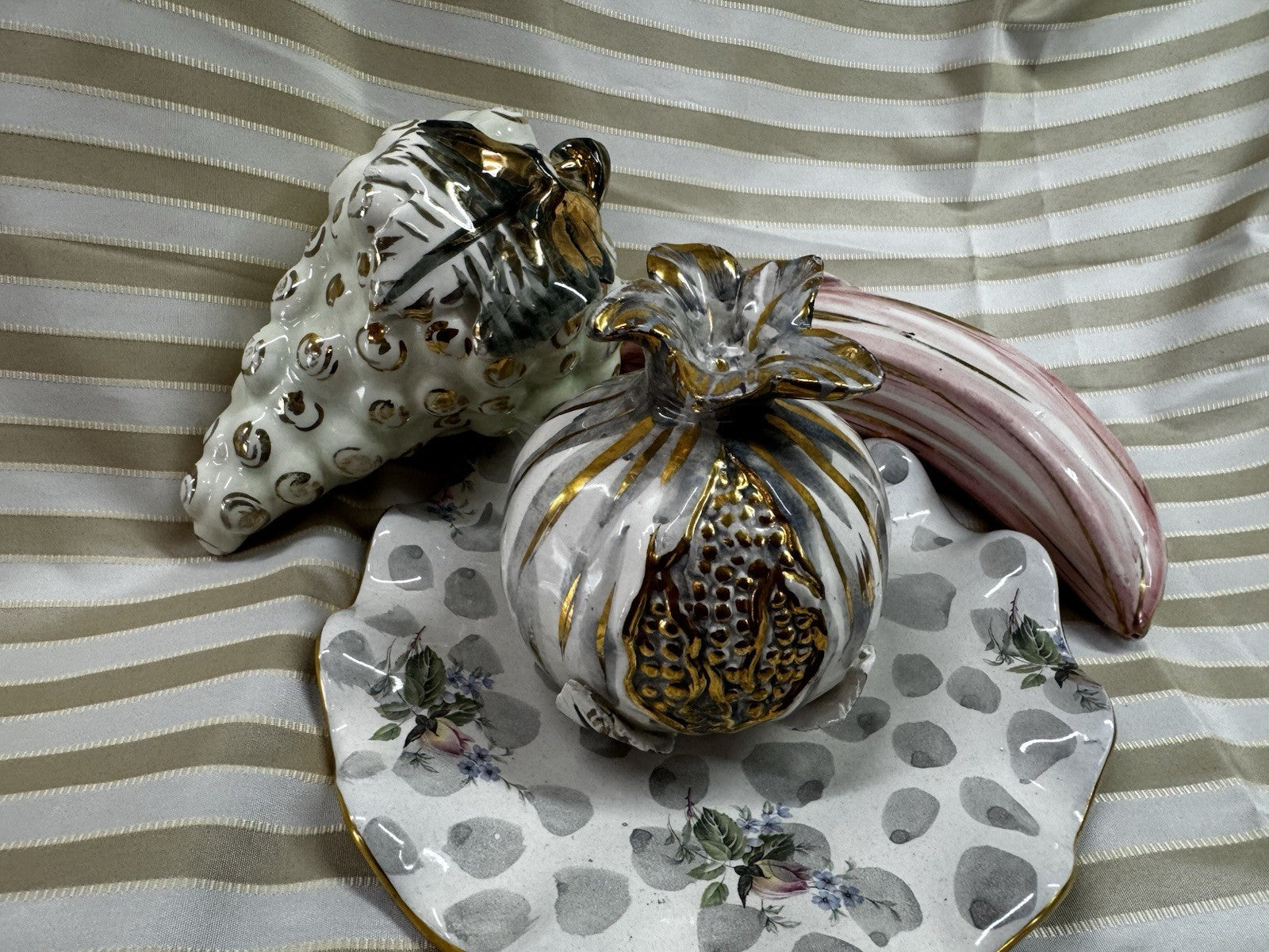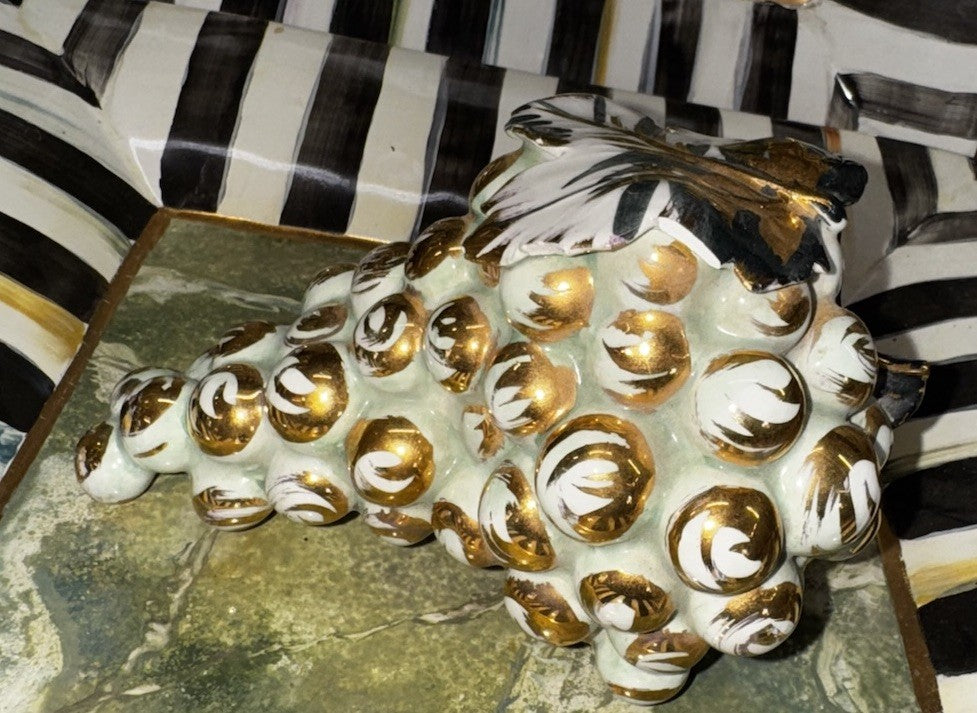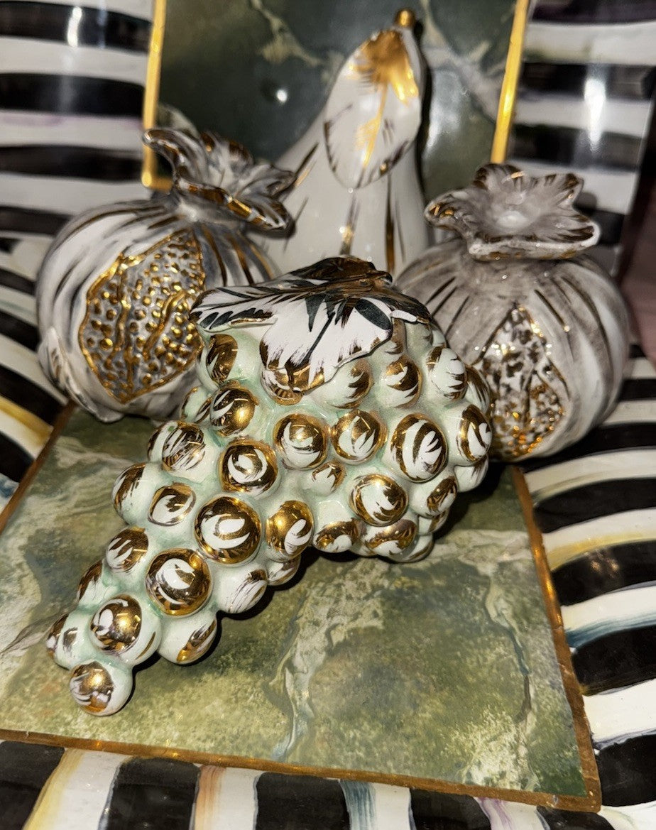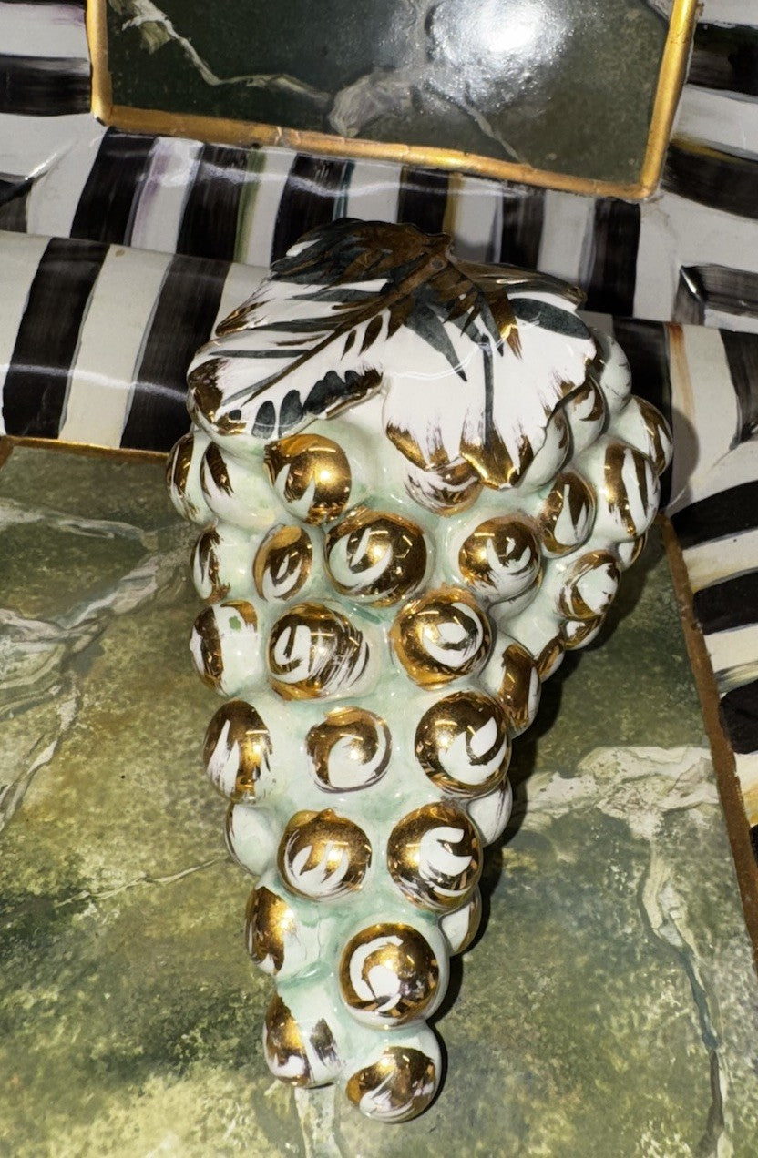 The product is an MCM Italian ceramic hand-painted bundle of grapes in silver. It is a vintage decorative piece that is life-sized, making it a unique and eye-catching addition to a kitchen or dining room. The combination of gray, white, and gold colors adds a touch of elegance to any space, while the ceramic material ensures durability and longevity. Made in the United States, this one-of-a-kind item stands at 4.5 inches tall and 4.5 inches long, making it a striking focal point for any home decor.