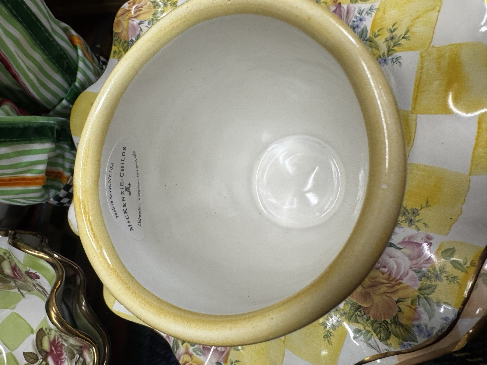 This beautiful MacKenzie-Childs mug is a must-have for any collector or lover of unique, high-quality ceramics. The mug features a charming checked pattern in shades of pink and green, with a height of 4.5 inches and a capacity of 11 ounces. It's perfect for use at any occasion, whether you're enjoying your morning coffee or hosting a tea party.