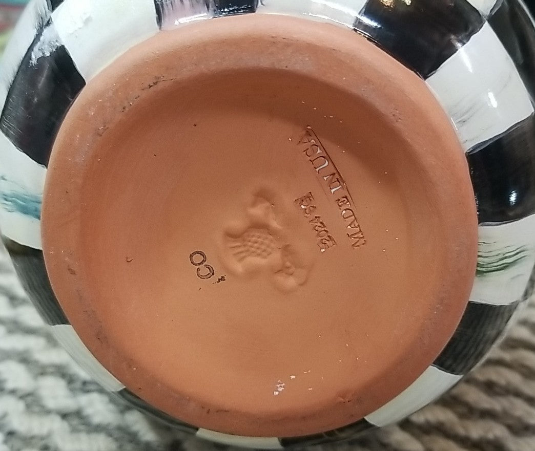 Pitcher is sized just right for holding water, lemonade, or fresh flowers. Hand made and Hand-painted with color-dragged courtly check , it's trimmed with gold lustre dots on the handle