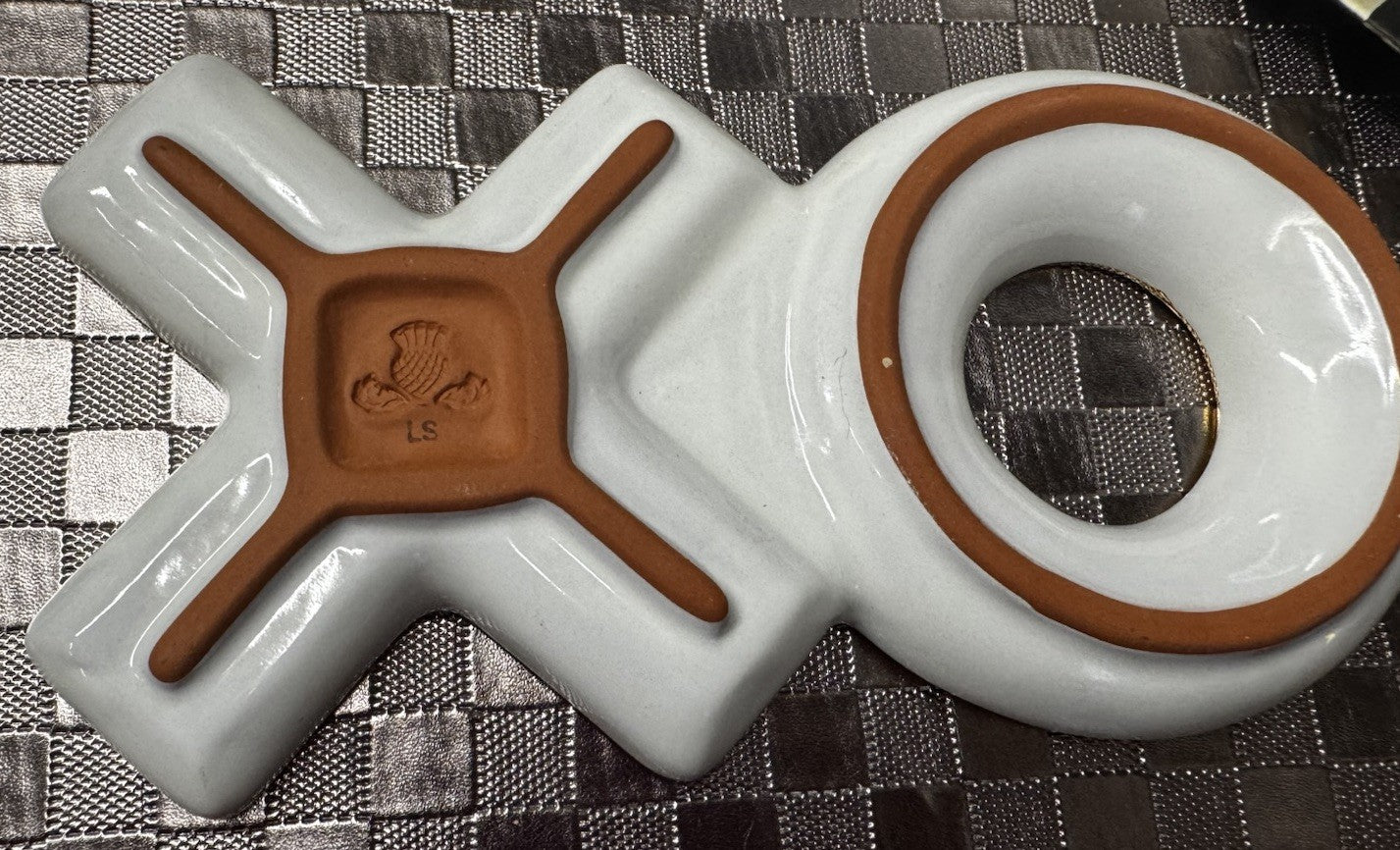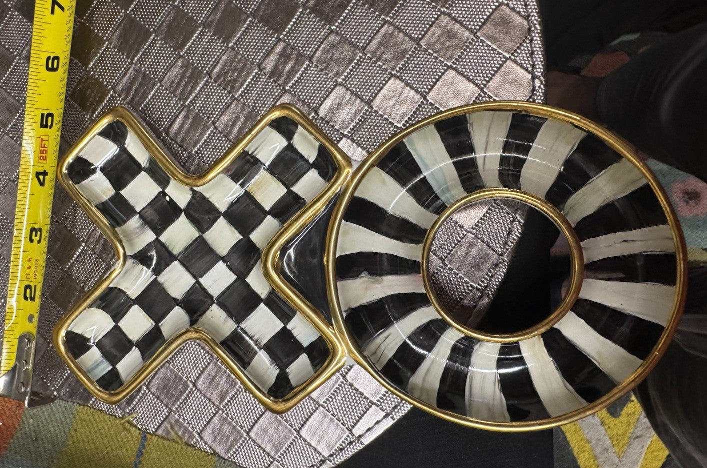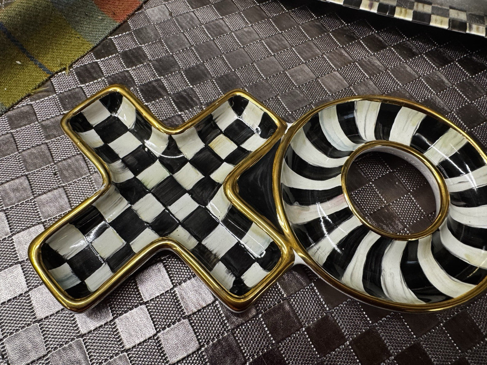 The Mackenzie Childs Courtly Check XO Plate is a stylish ceramic trinket dish made in Aurora, measuring 10" long. This modern and polished piece features a black, white, and gold color scheme with a checkered theme, perfect for adding a touch of elegance to your bathroom decor.