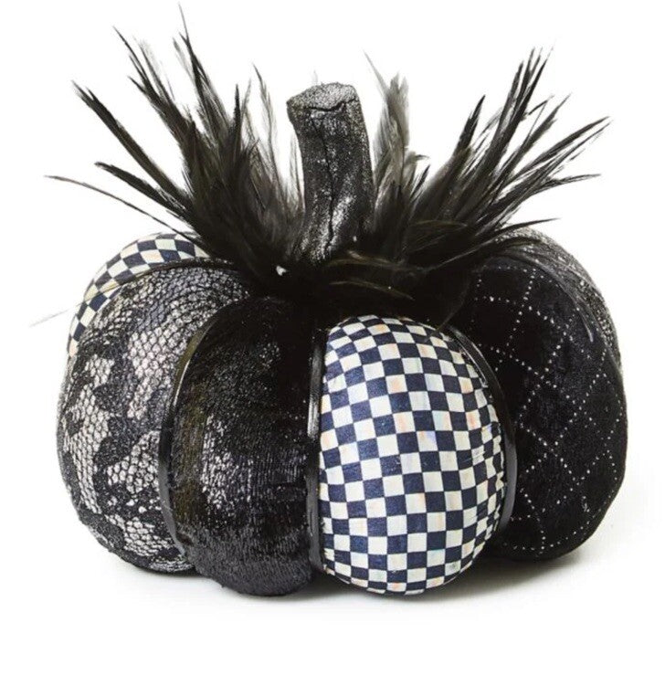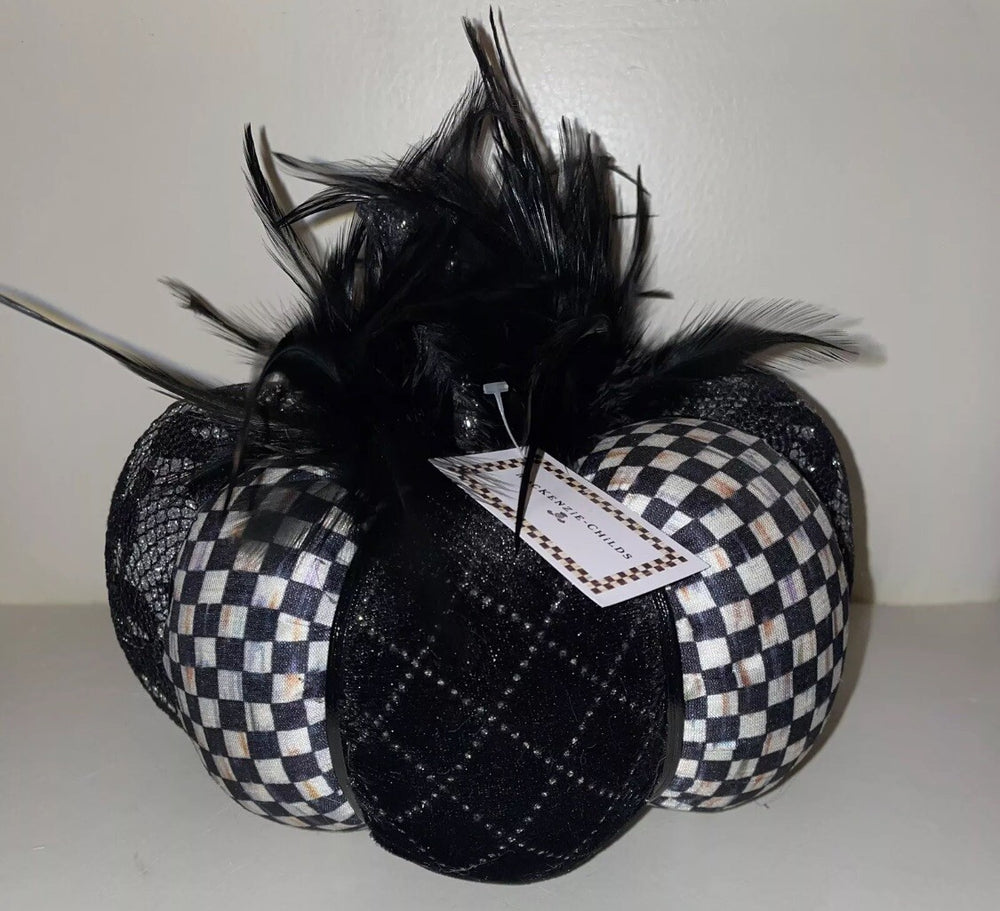 Mackenzie Childs Velvet & Fabric Black Feather Pumpkin Courtly Check New Medium