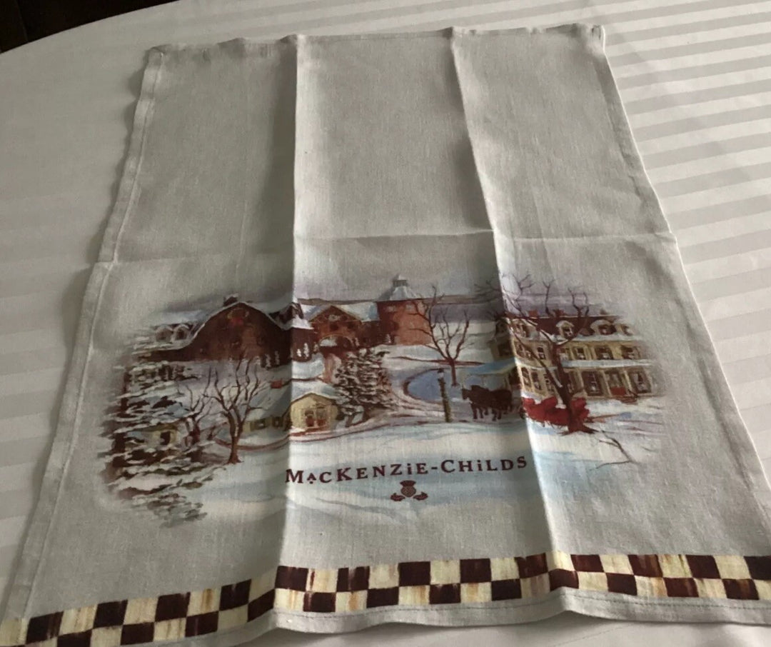 MACKENZIE CHILDS Linen Christmas Tea Towel- Retired Farm Scenery Winter- Rare