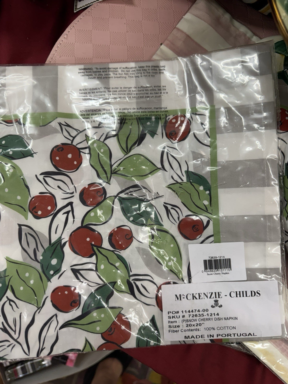 The Mackenzie Childs Snow Cherry 100% Cotton Napkin set includes 2 square-shaped napkins featuring a beautiful Snow Cherry pattern. Made in Portugal, these 20"x20" napkins are perfect for all occasions and are a stylish addition to any kitchen or dining table. The vibrant Snow Cherry color adds a pop of color to your dining experience, making it a must-have for any home looking to add a touch of elegance to their table settings.