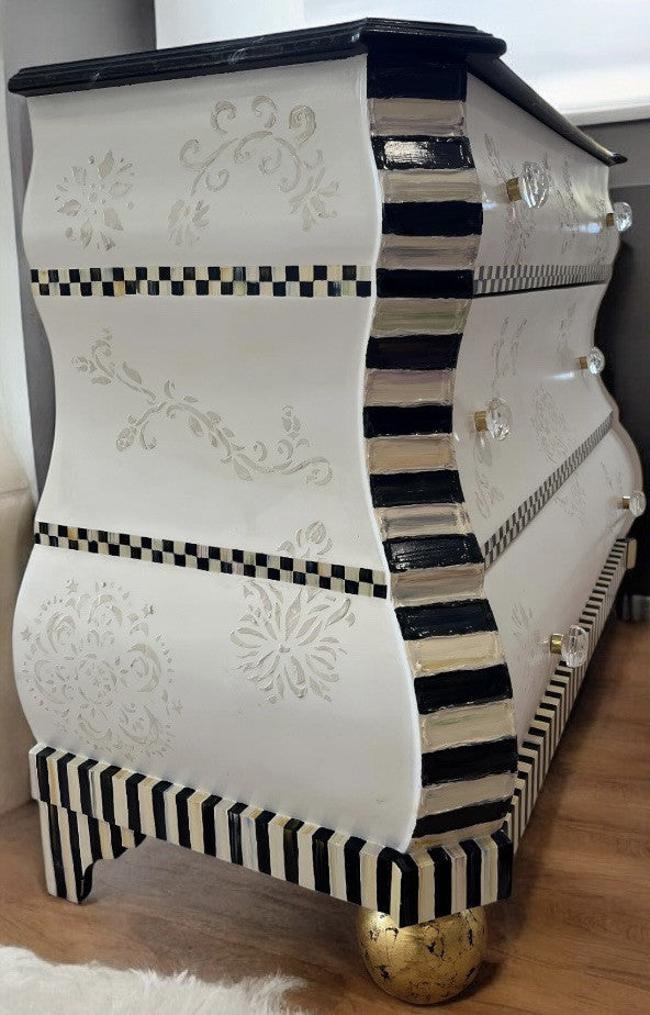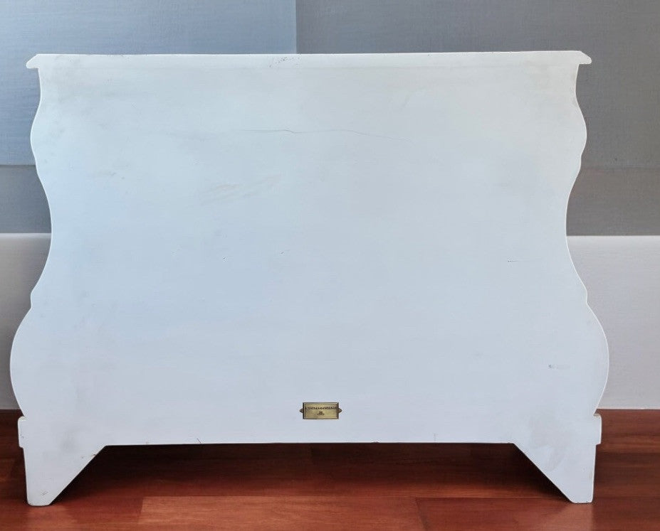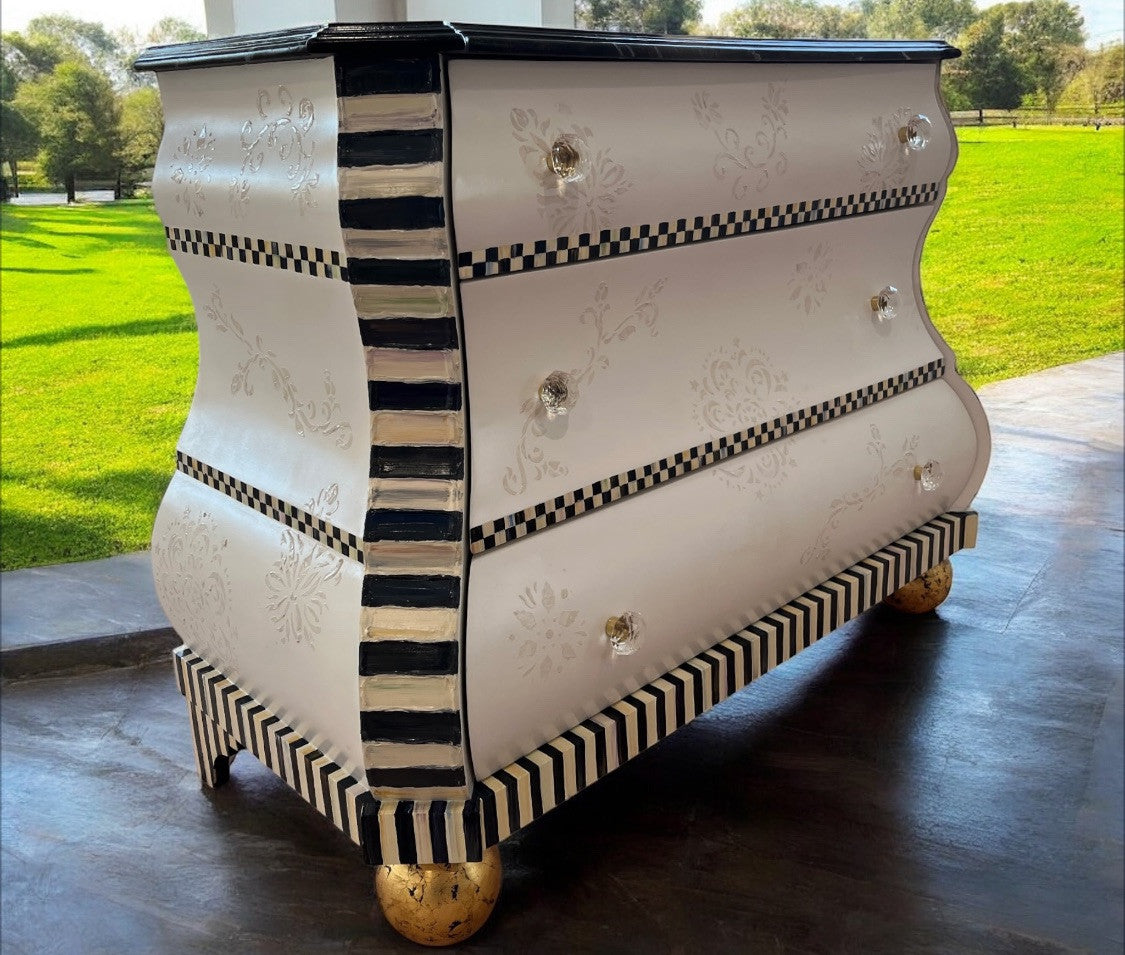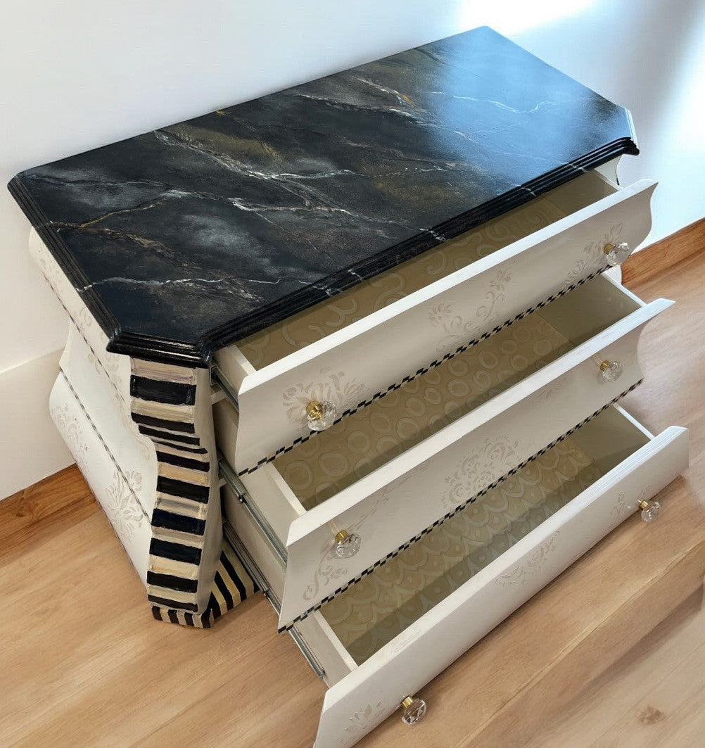Soft and sensuous, curvaceous and cool. Glass knobs, gold gilded feet and marbleized top. White on white handpainted pattern as lovely as lace.