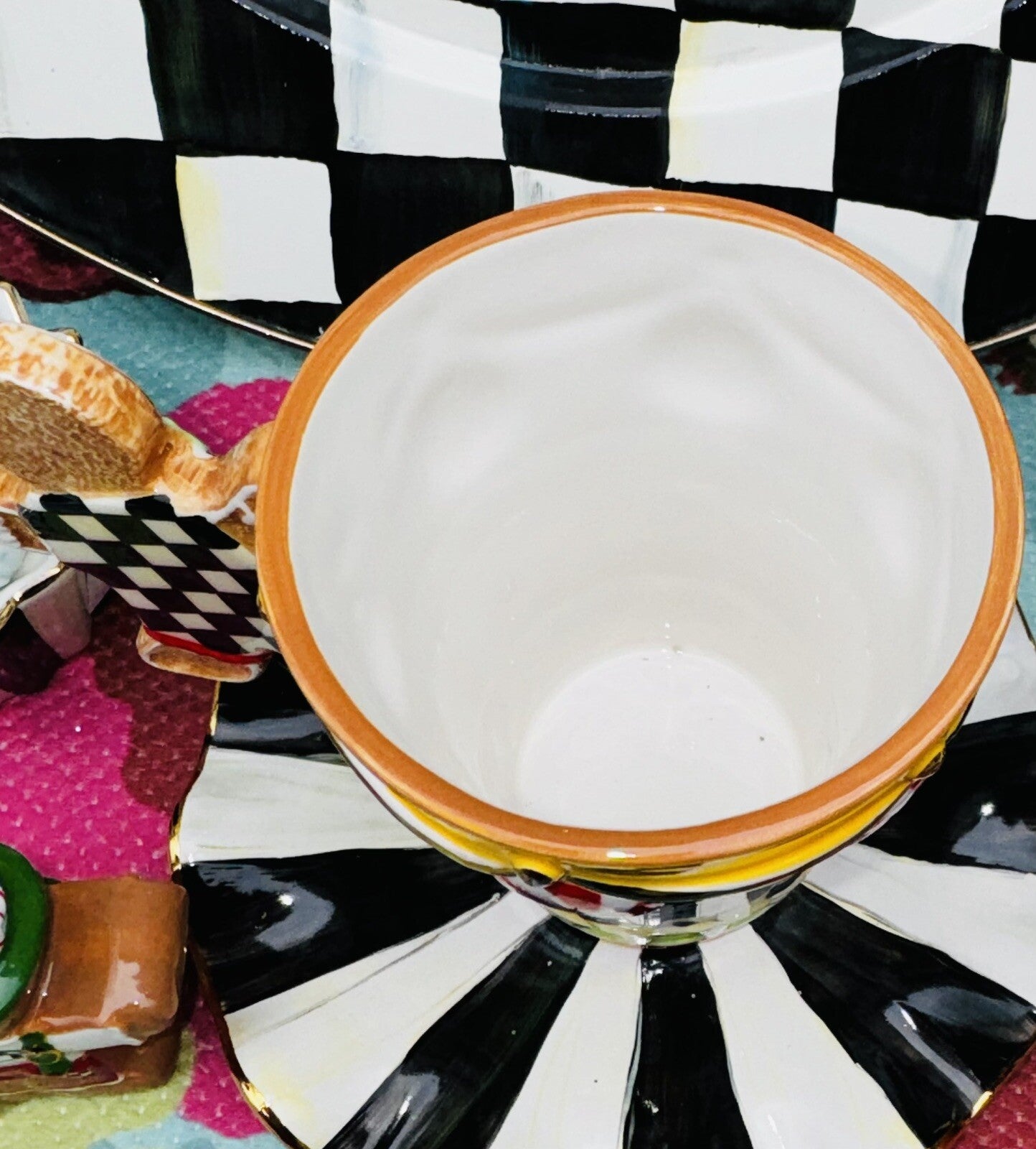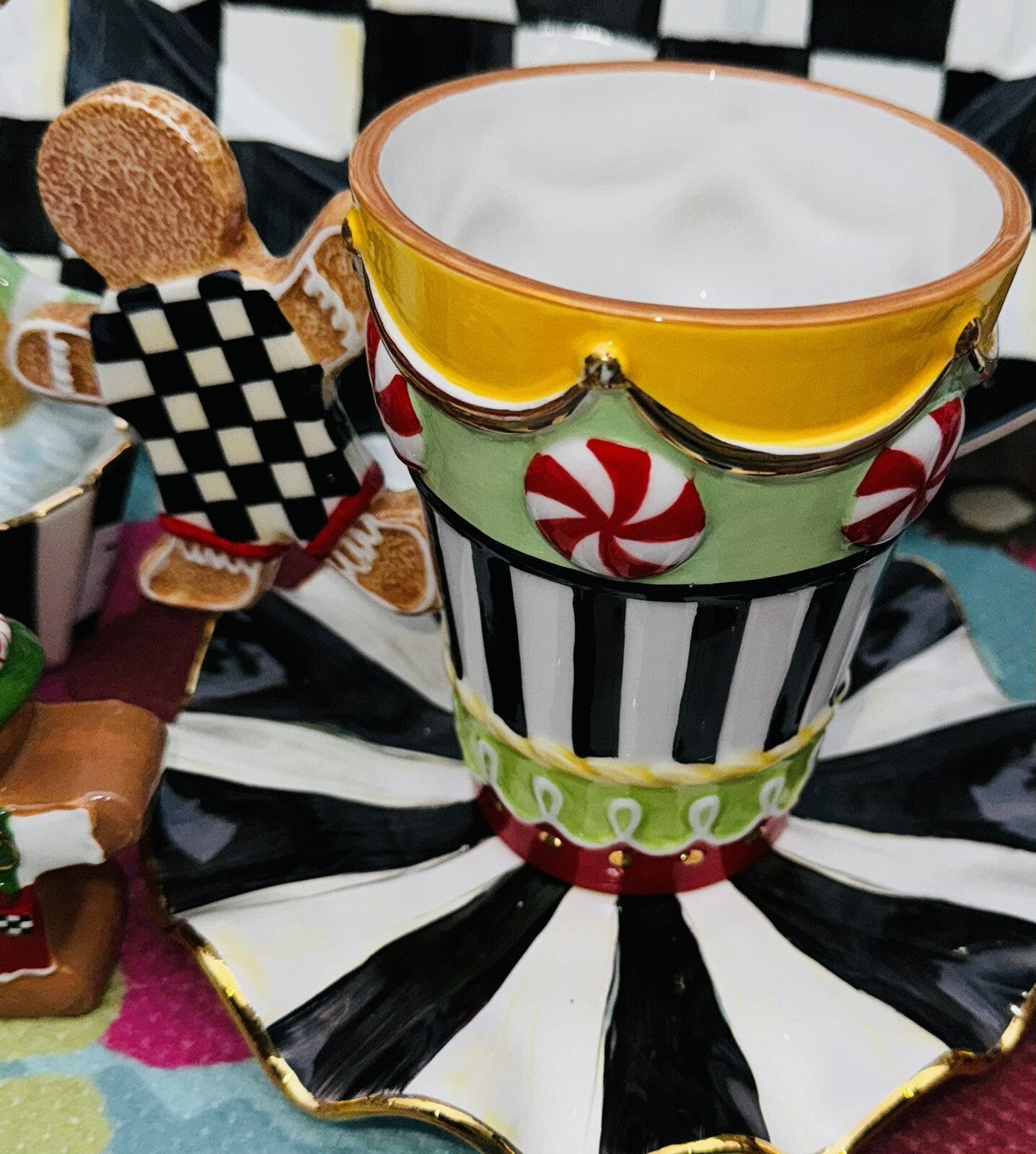 Body is decorated with Courtly Stripe, with a Courtly Check gingerbread man serving as a handle