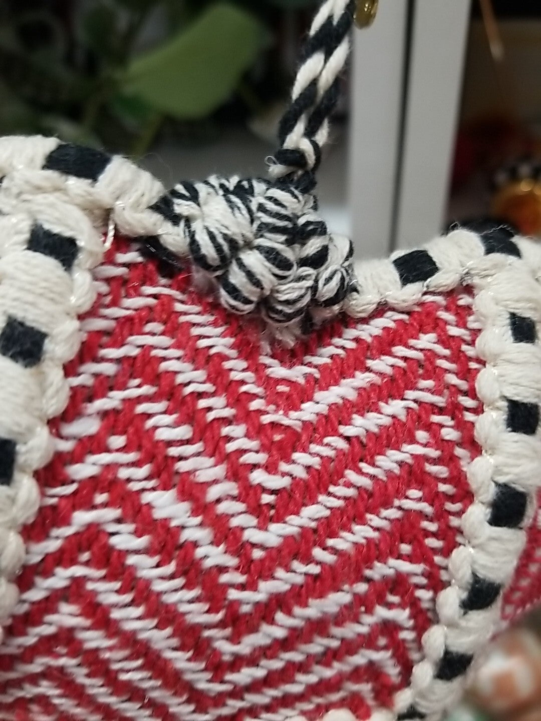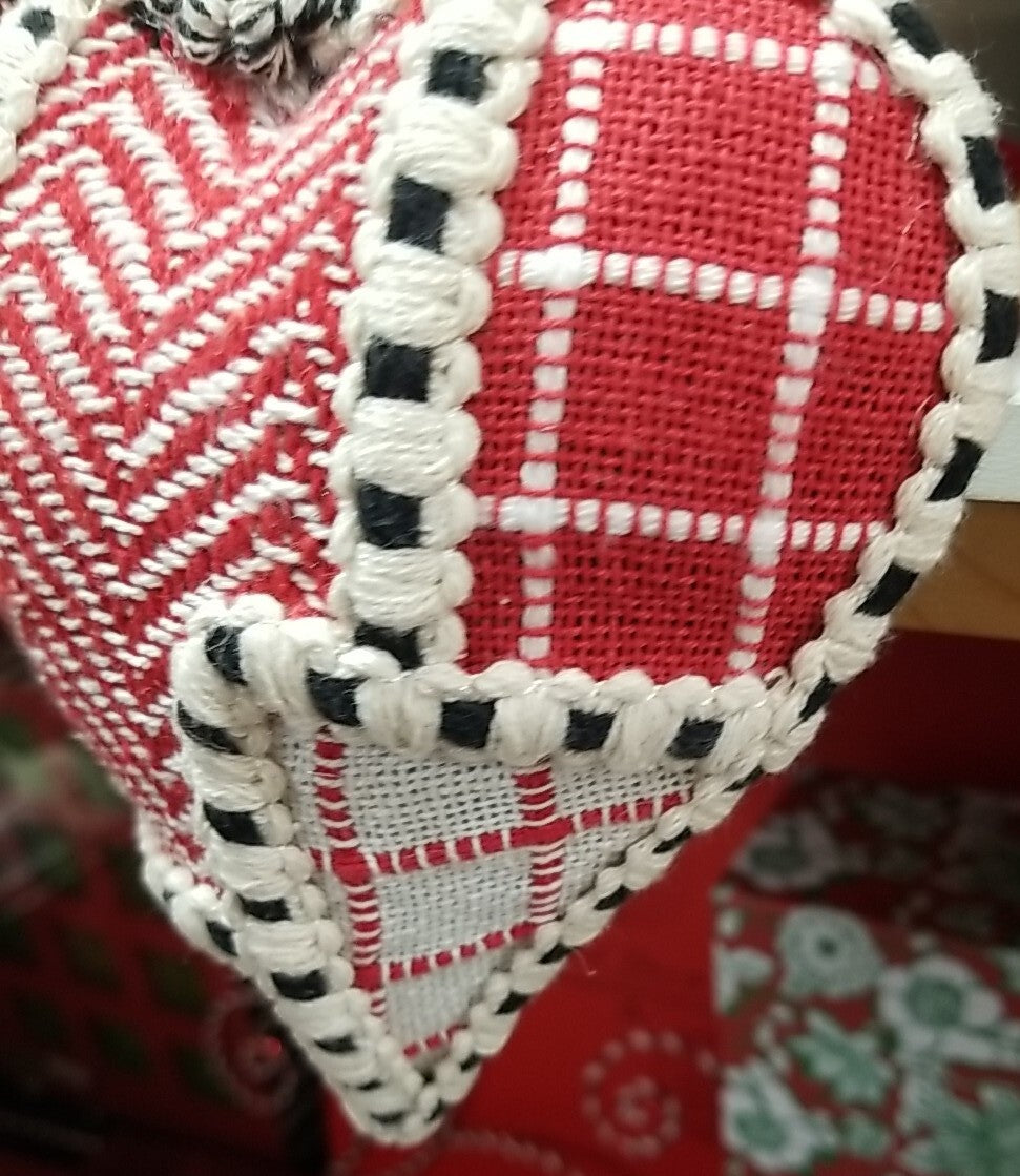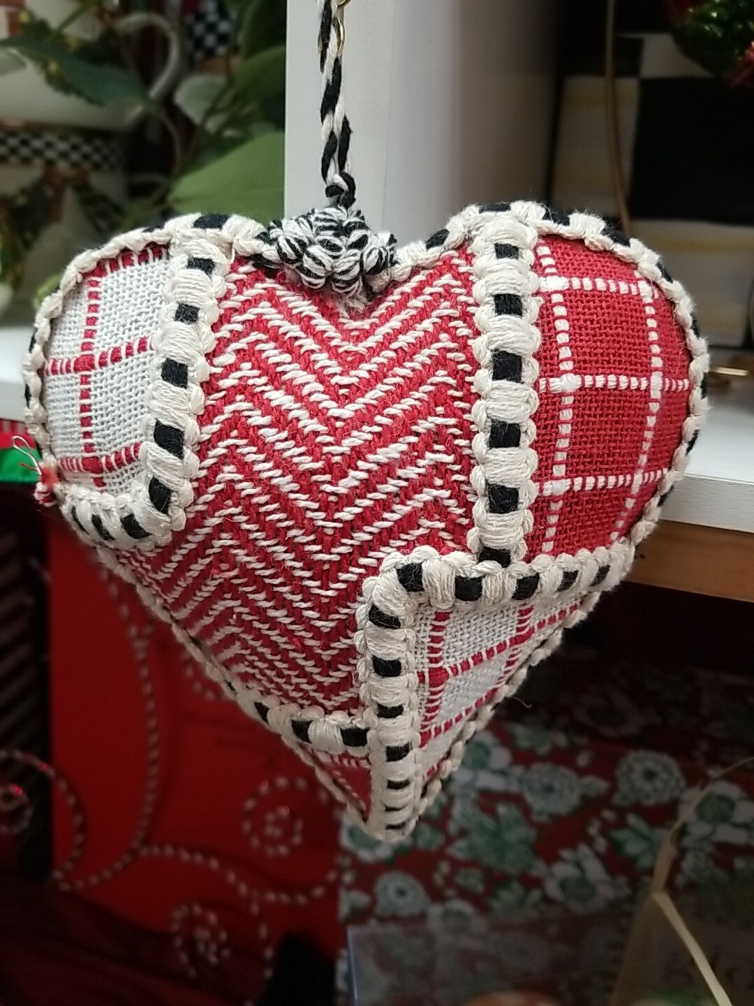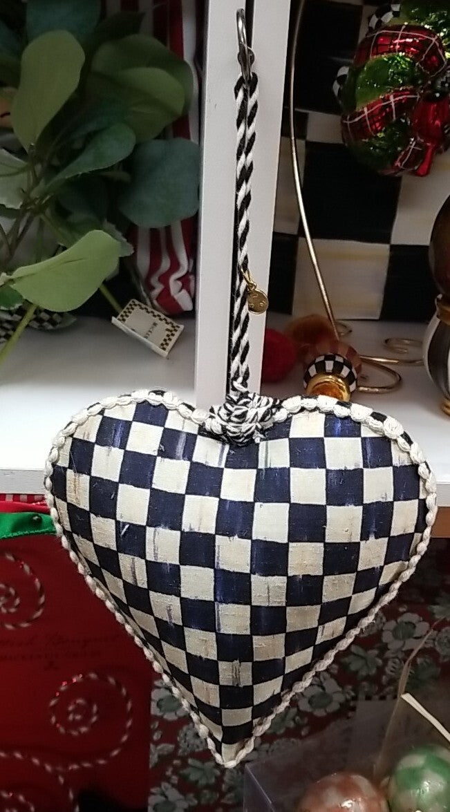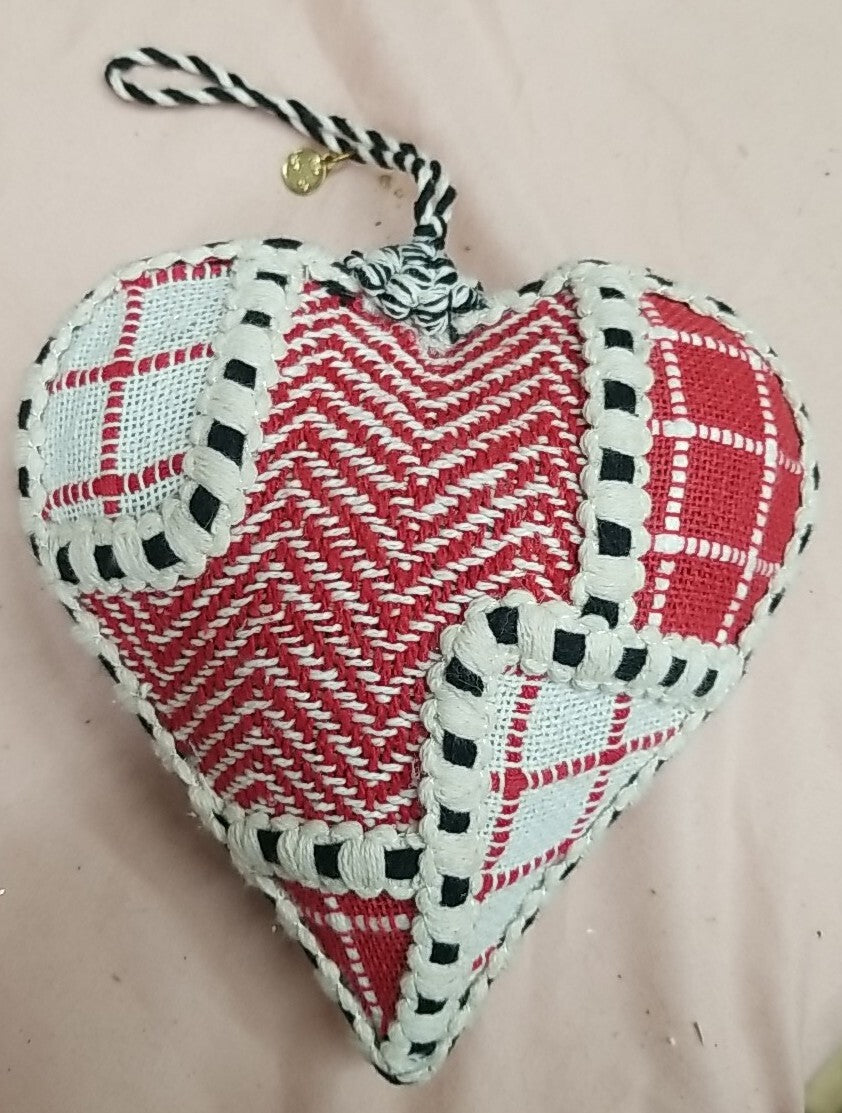 This MacKenzie-Childs ornament features a cozy Christmas design with a patchwork pattern of hearts. It measures 5.5 inches wide, 10 inches tall, and 2.5 inches deep, making it a charming addition to your holiday decor.
