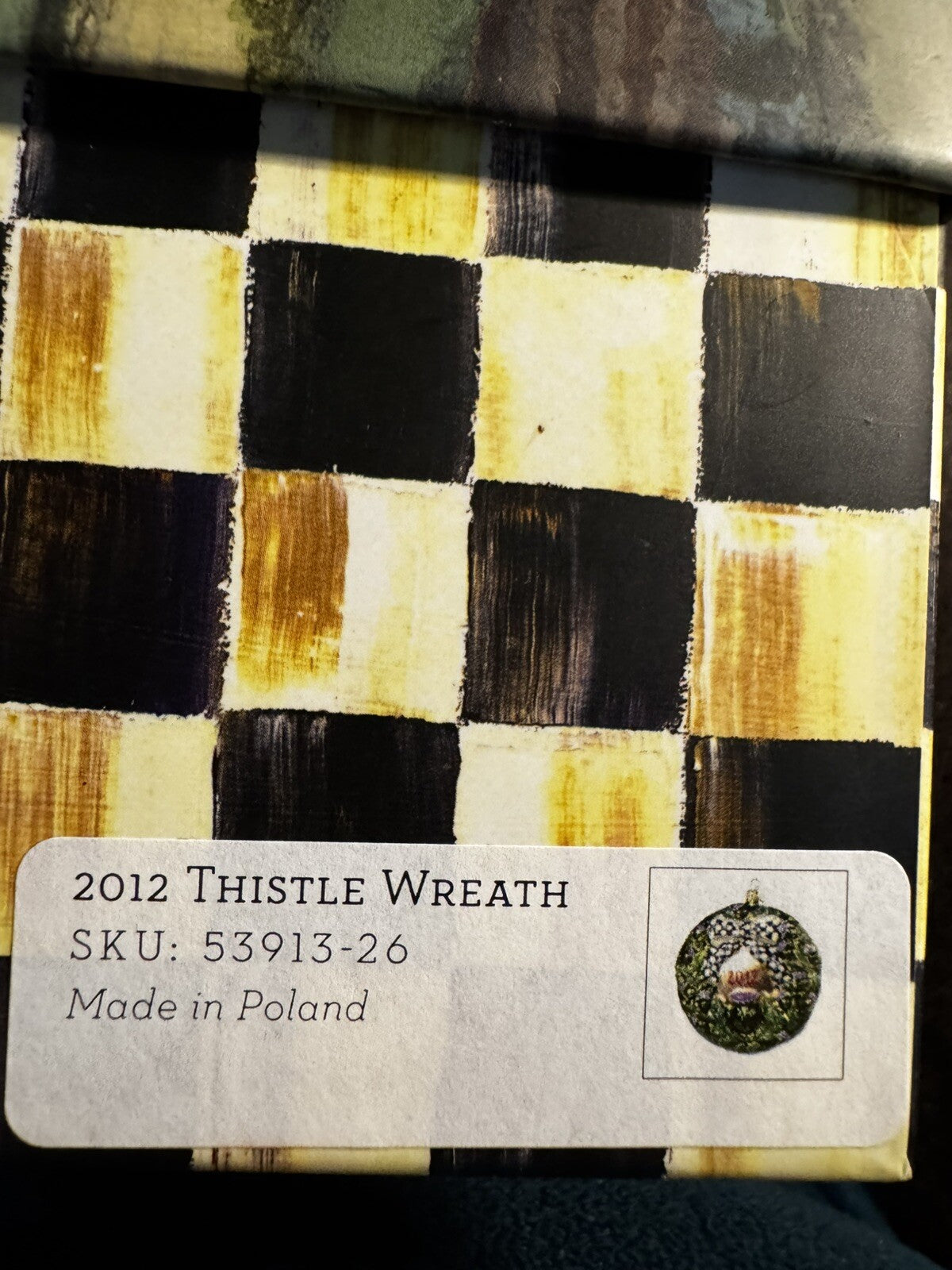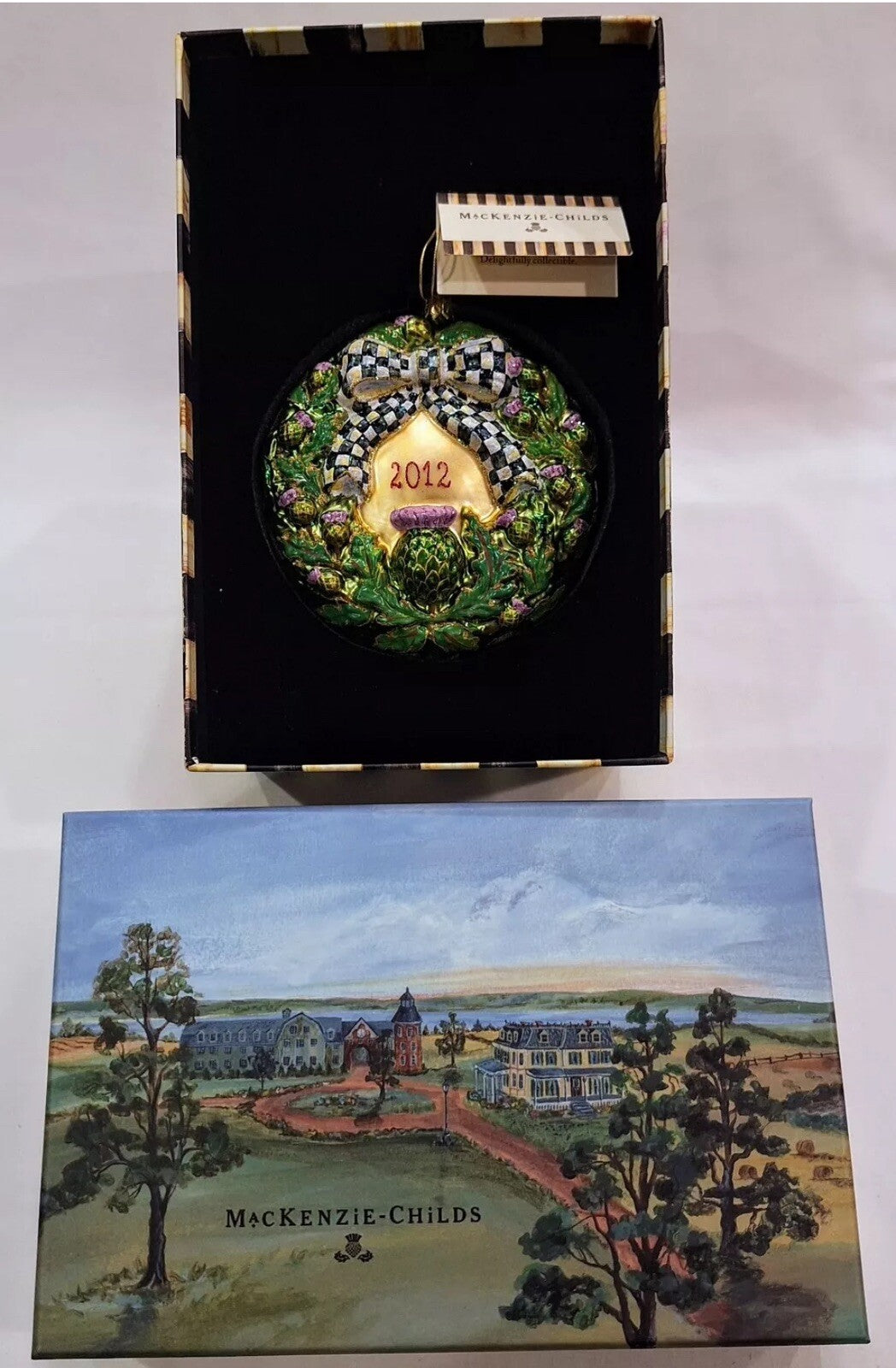 The MacKenzie-Childs Glass Thistle Ornament Wreath from 2012 is a beautiful addition to any Christmas decor collection. This 4-inch round ornament features a stunning thistle pattern, exuding a festive Christmas theme. Made of glass, it comes in its original box, making it a perfect gift or decoration for the holiday season. Its intricate design and attention to detail showcase the craftsmanship for which MacKenzie-Childs is known, creating a unique and elegant ornament for your tree or home.