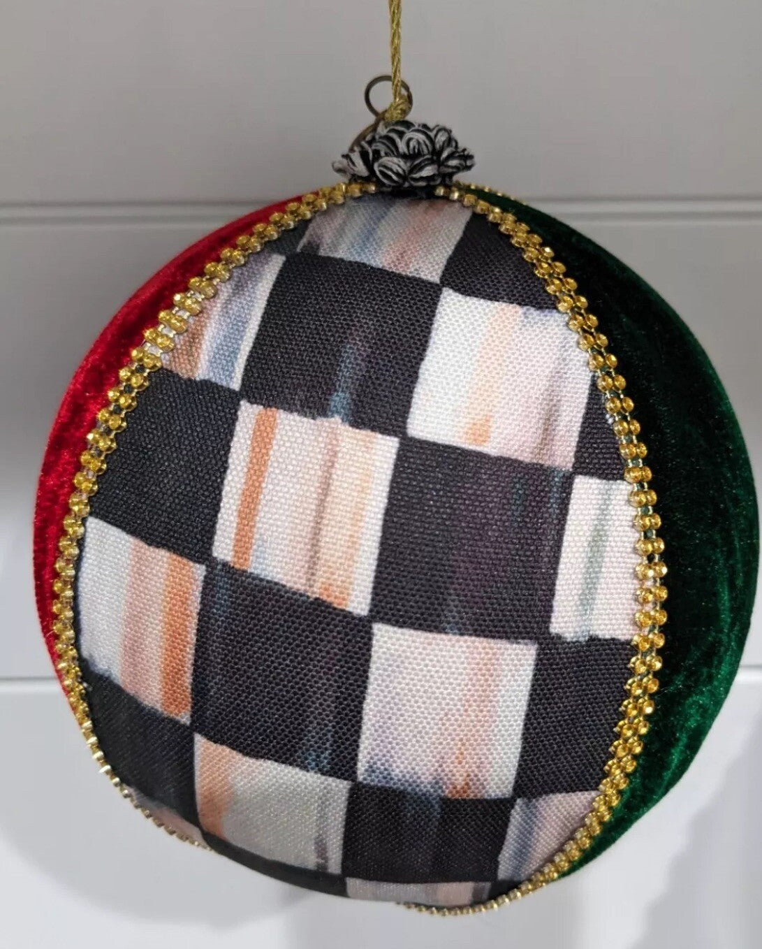 Add a touch of elegance to your holiday decorations with this beautiful MACKENZIE CHILDS Velvet Patchwork and Courtly Check Large Ball Ornament. The ornament features a gorgeous patchwork design on a round shape, with rich shades of red, green, gold and the iconic Courtly Check accents add a touch of glamour to the overall look. The ornament is made of high-quality velvet and fabric materials, ensuring its durability and longevity.