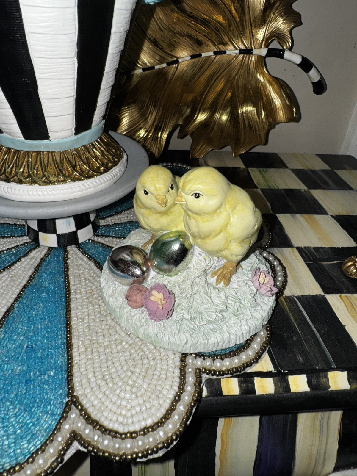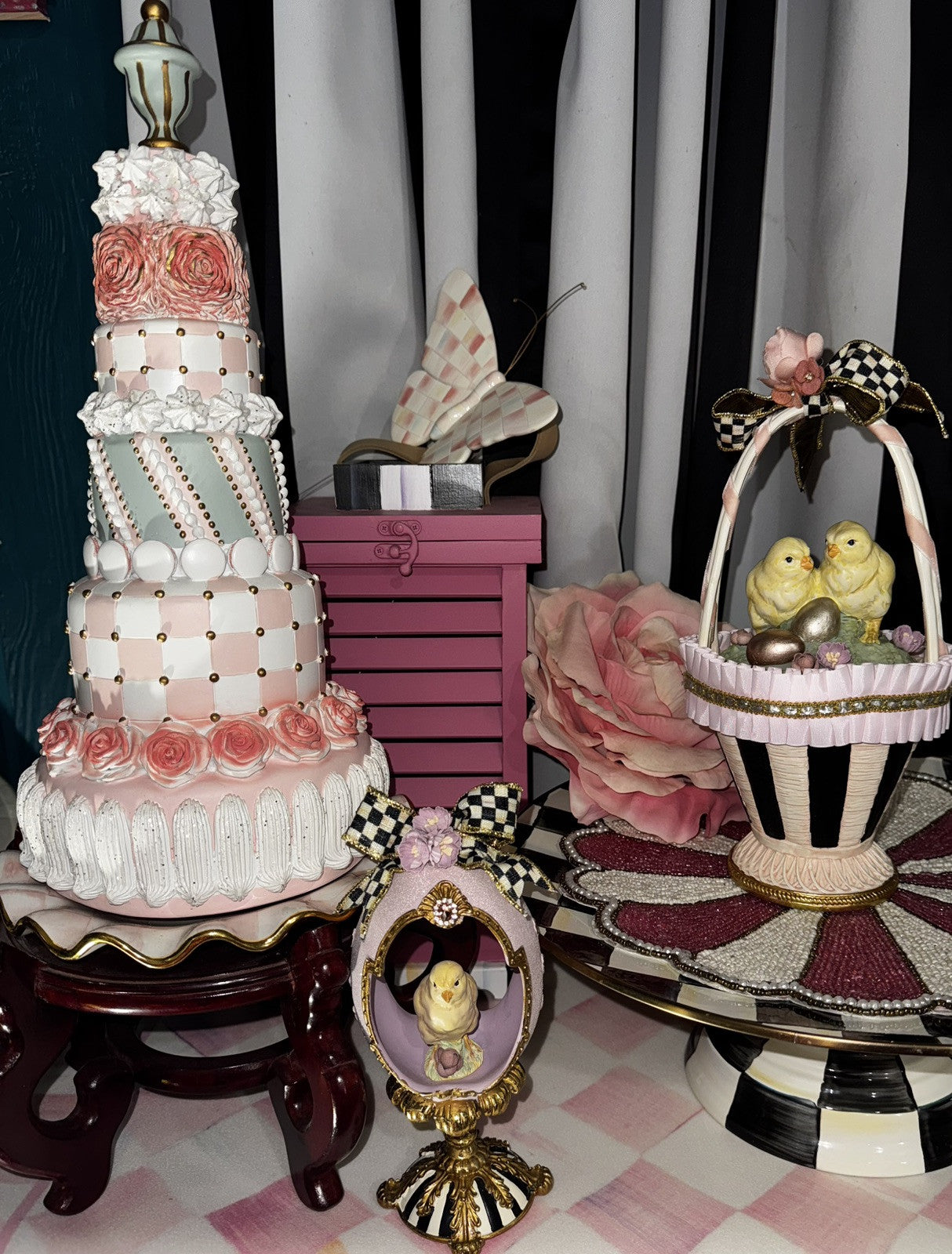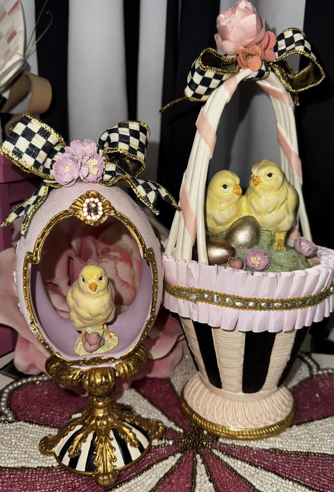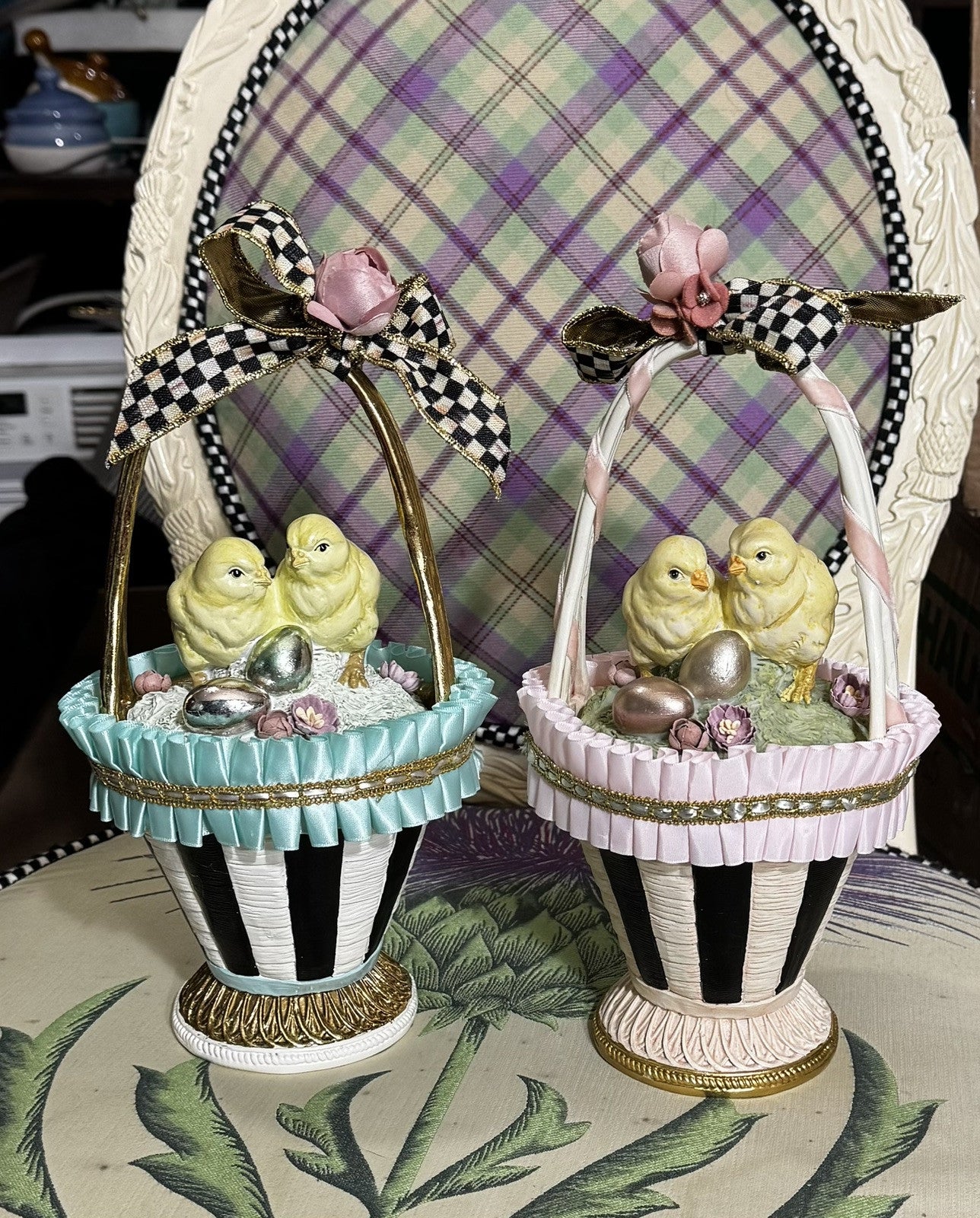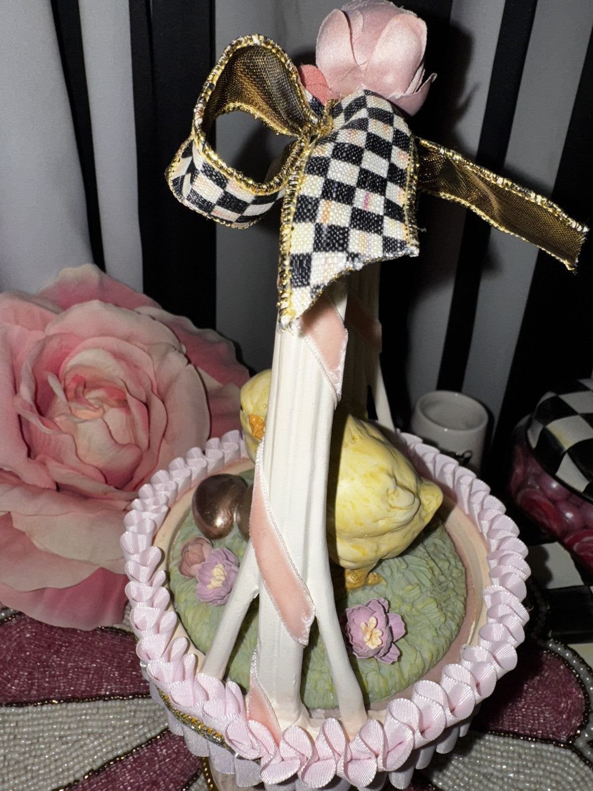 RARE A pair of hand-painted chicks top the lid of a basket decorated with ruffled satin ribbon and Courtly Stripes, finished with golden trim. Lift the lid, and there's a special spot for a keepsake inside the container, which is lined with velvet