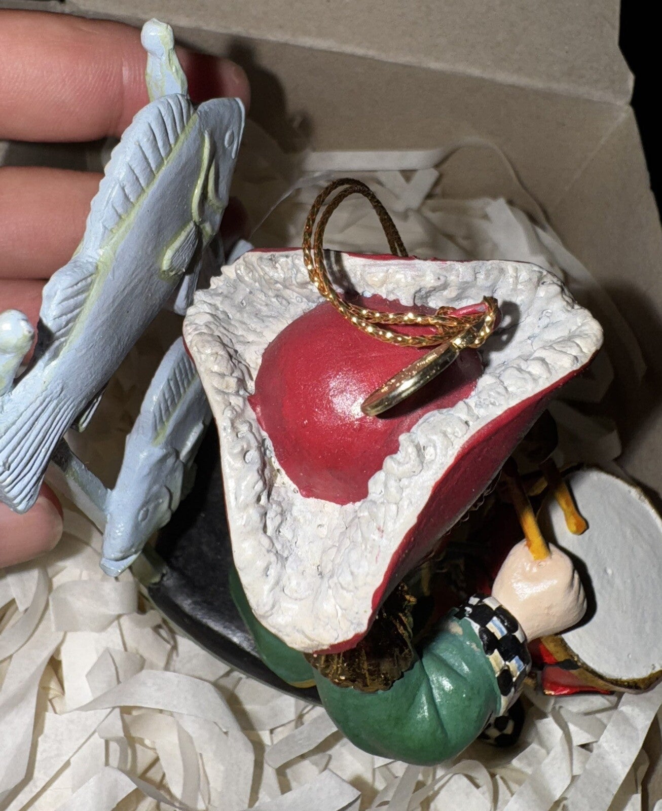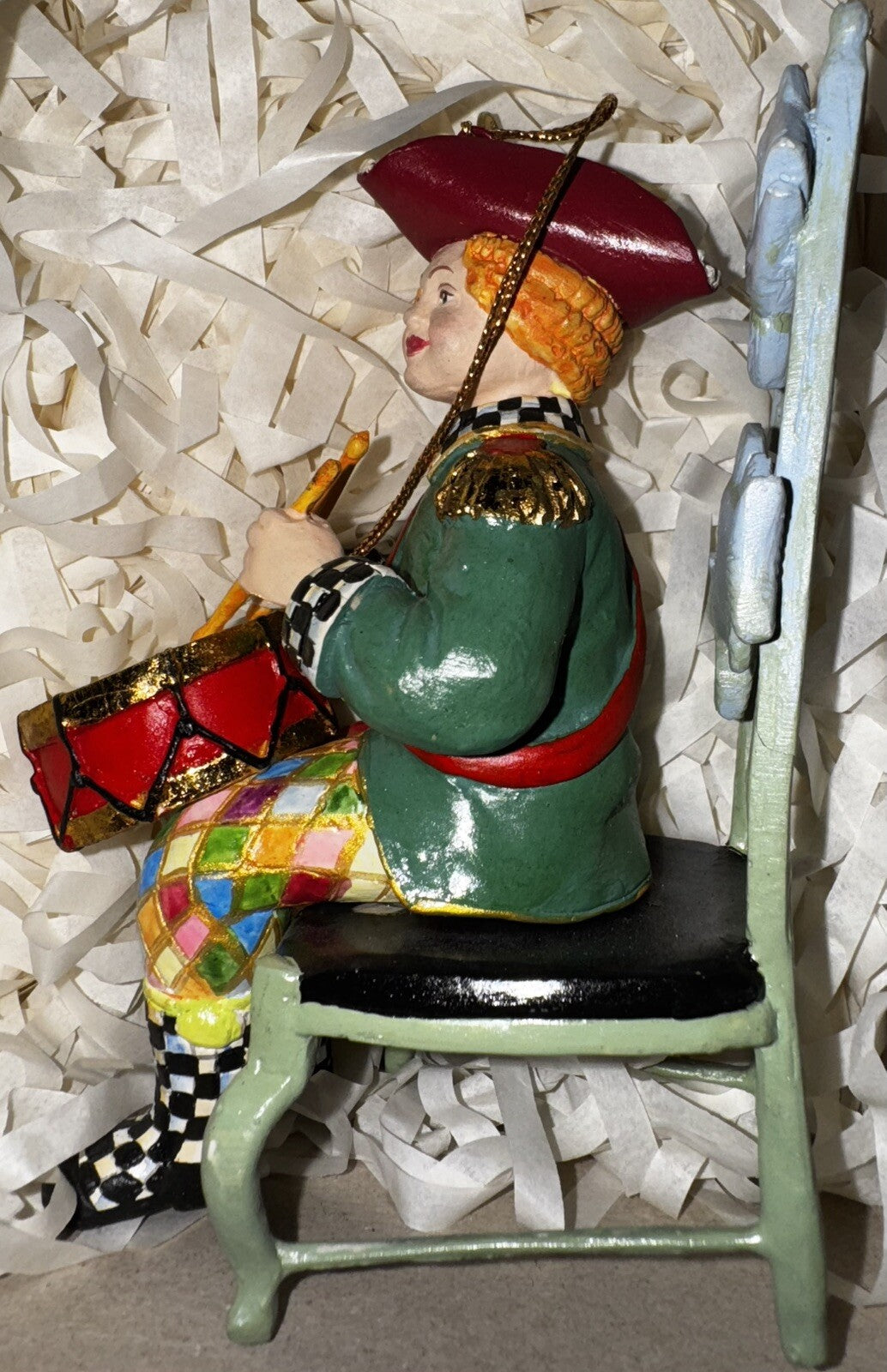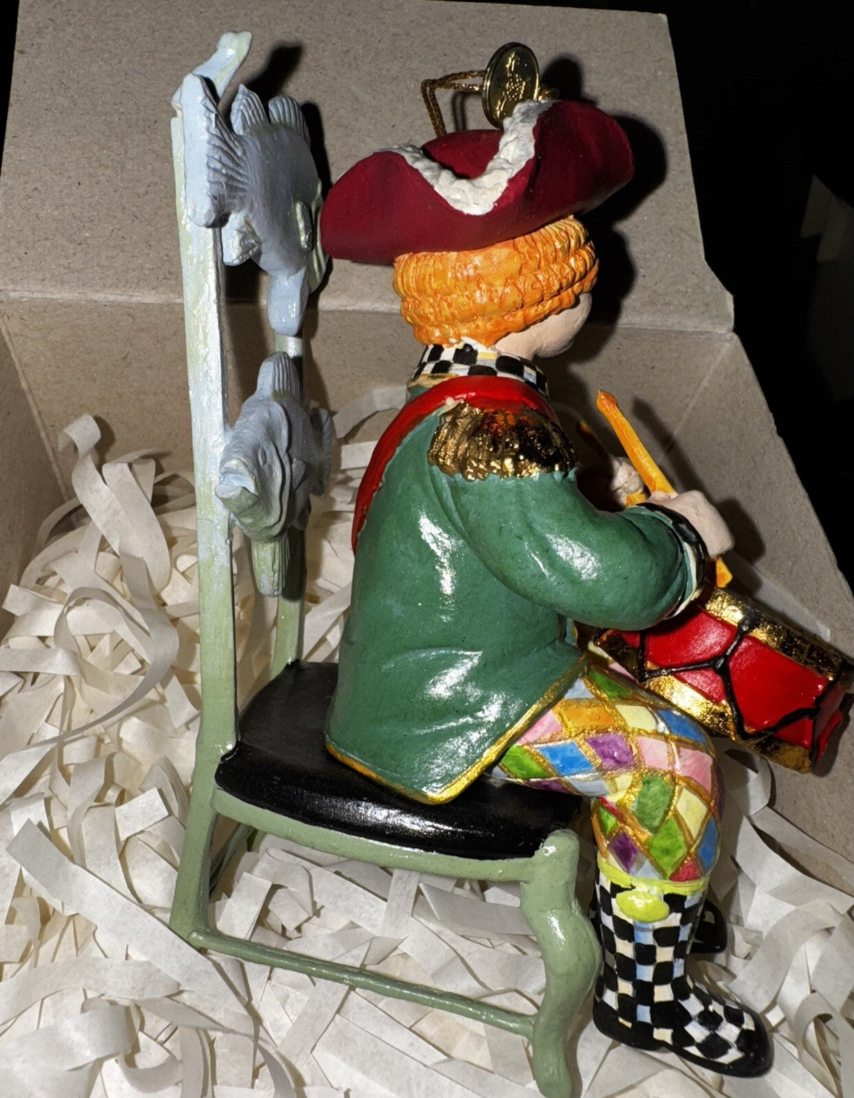 The Mackenzie-Childs Twelve Days of Christmas Drummer Drumming hanging decoration features a drummer in a Mck Fish chair design, making it a charming addition to your holiday decor. This artist-designed ornament is made of resin and stands 4 inches tall, perfect for hanging on your Christmas tree. The set includes the hanging decoration in its original box, adding to its collectible appeal as part of the Twelve Days of Christmas franchise.