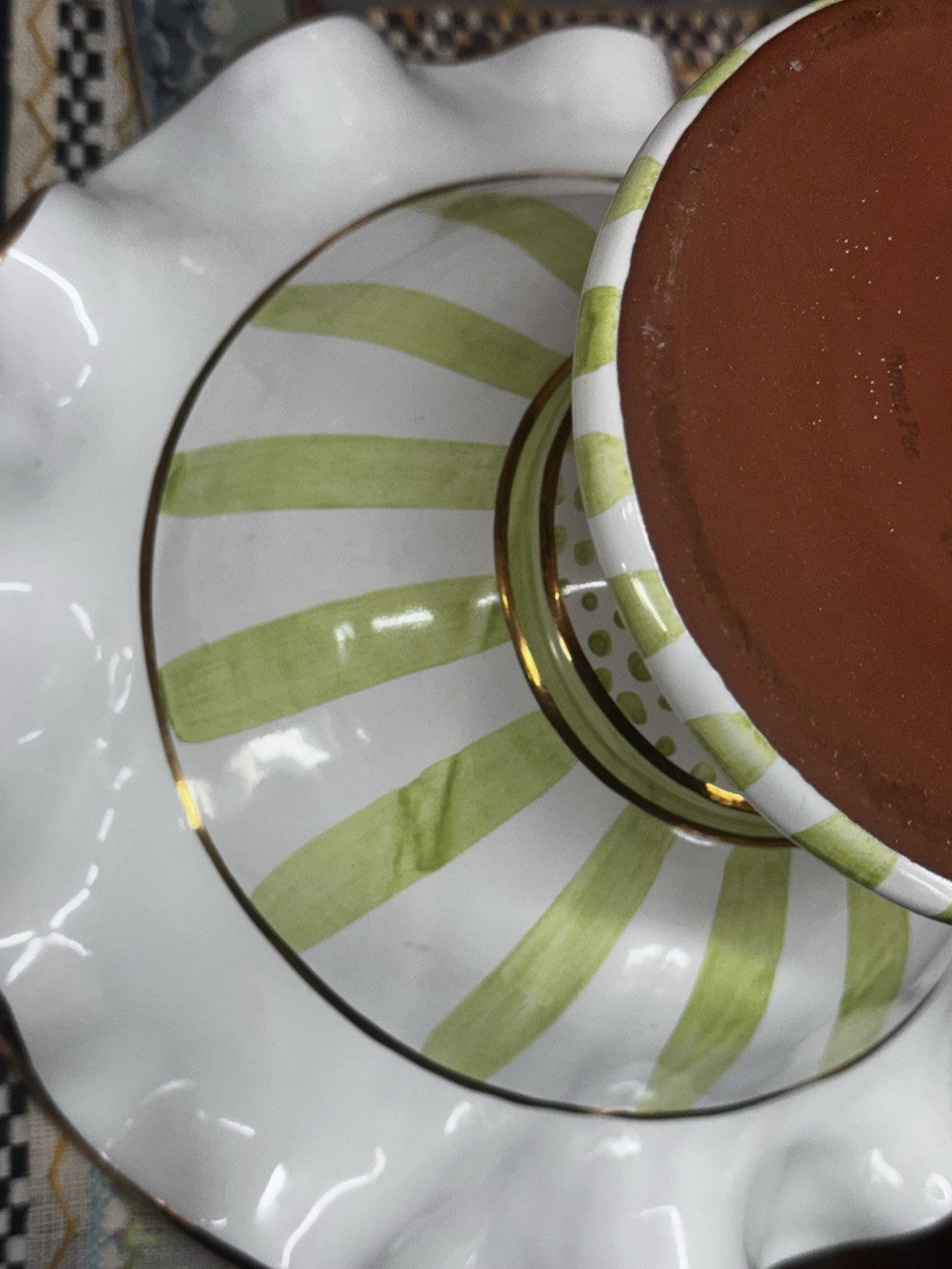 Handmade and hand-painted, it's trimmed with gold lustre and stamped by the artisans involved in its creation.