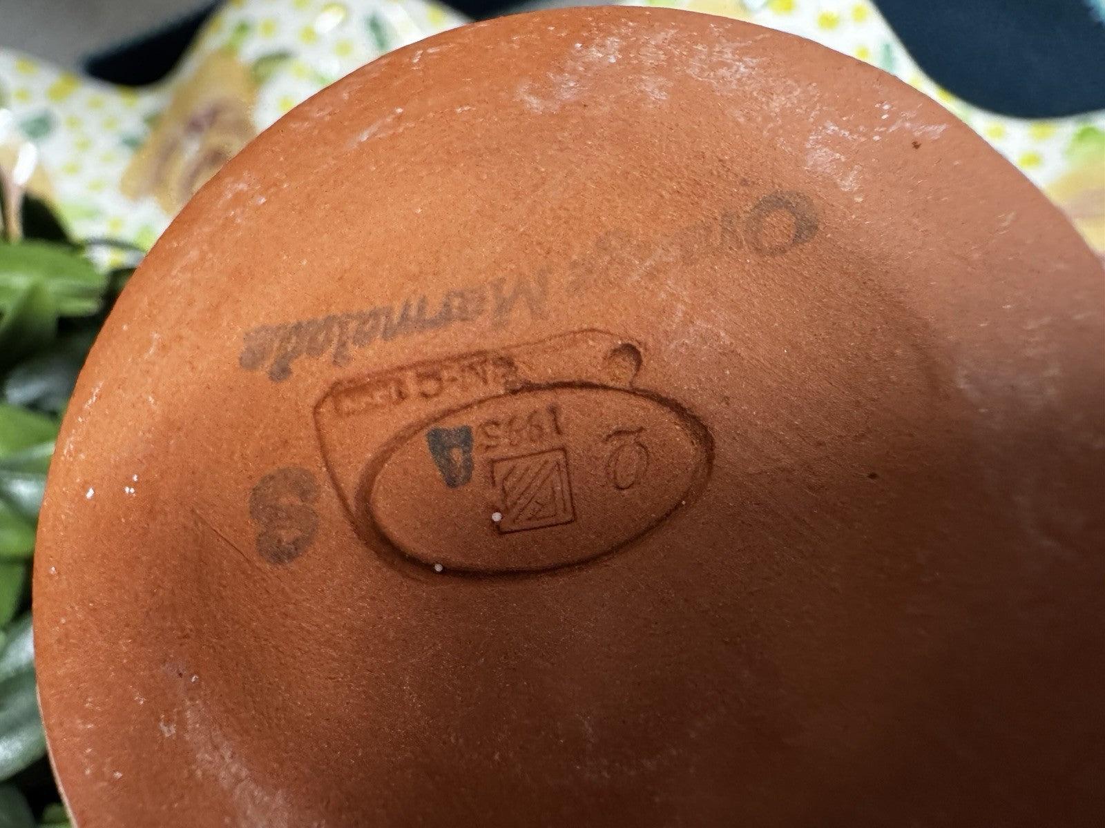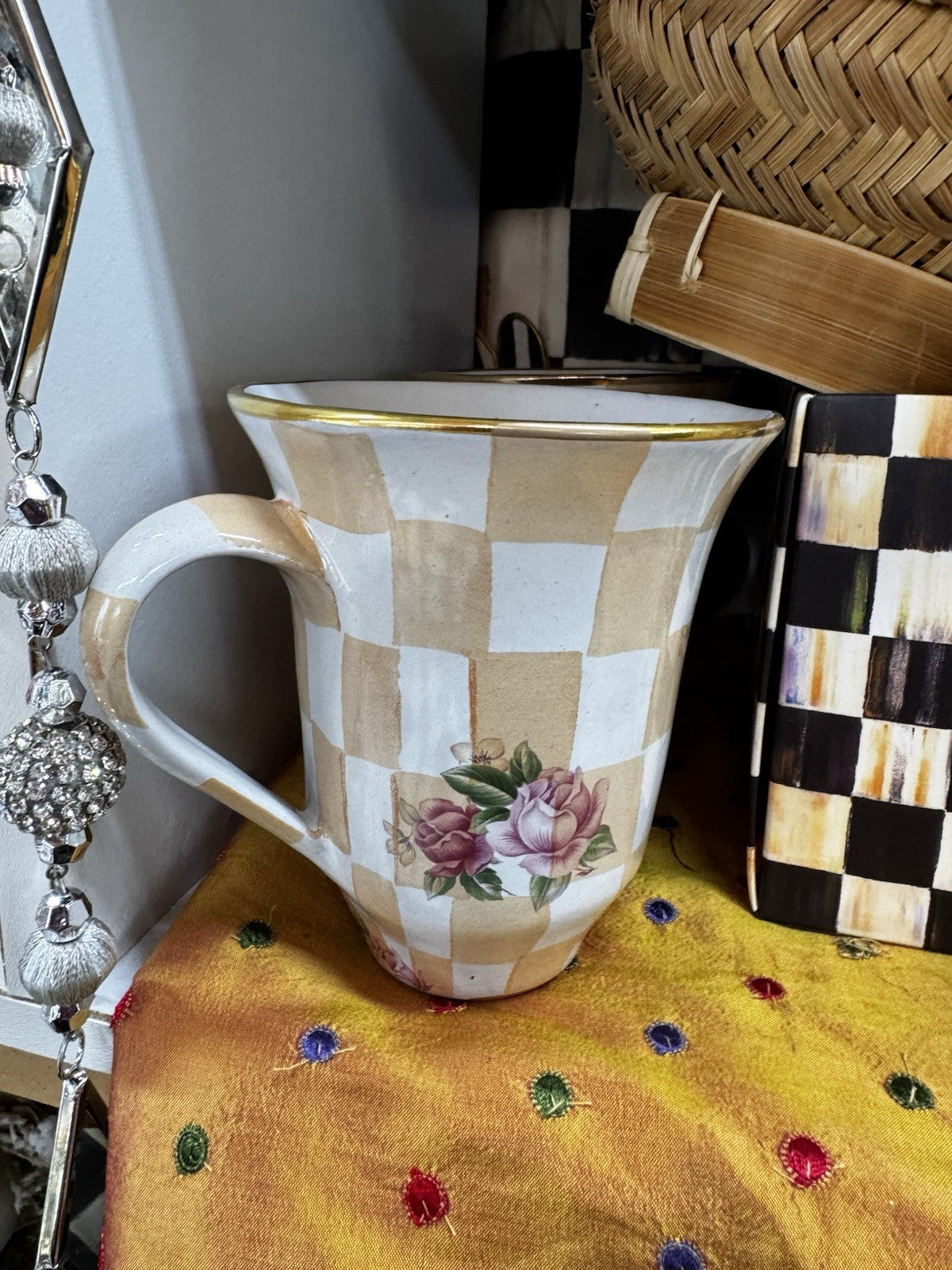 The MacKenzie-Childs Honeymoon Orange Marmalade Mug is a vintage piece from 1995, featuring a traditional design with a round shape and hand-painted pink roses within an orange check pattern. This small ceramic and porcelain mug has a capacity of 12 fl oz and is decorated with gold trim, making it suitable for both hot and cold beverages. With its unique and colorful design, this collectible mug is perfect for all occasions and can be enjoyed by unisex adults who appreciate art and floral themes in their kitchenware. Hand wash only to preserve its original charm.