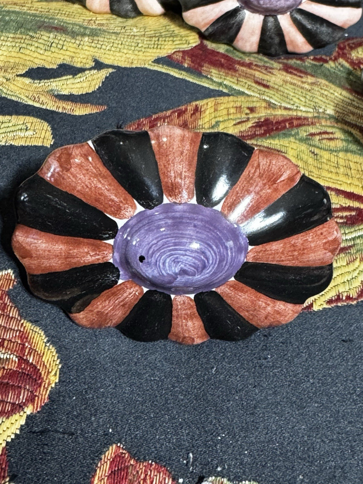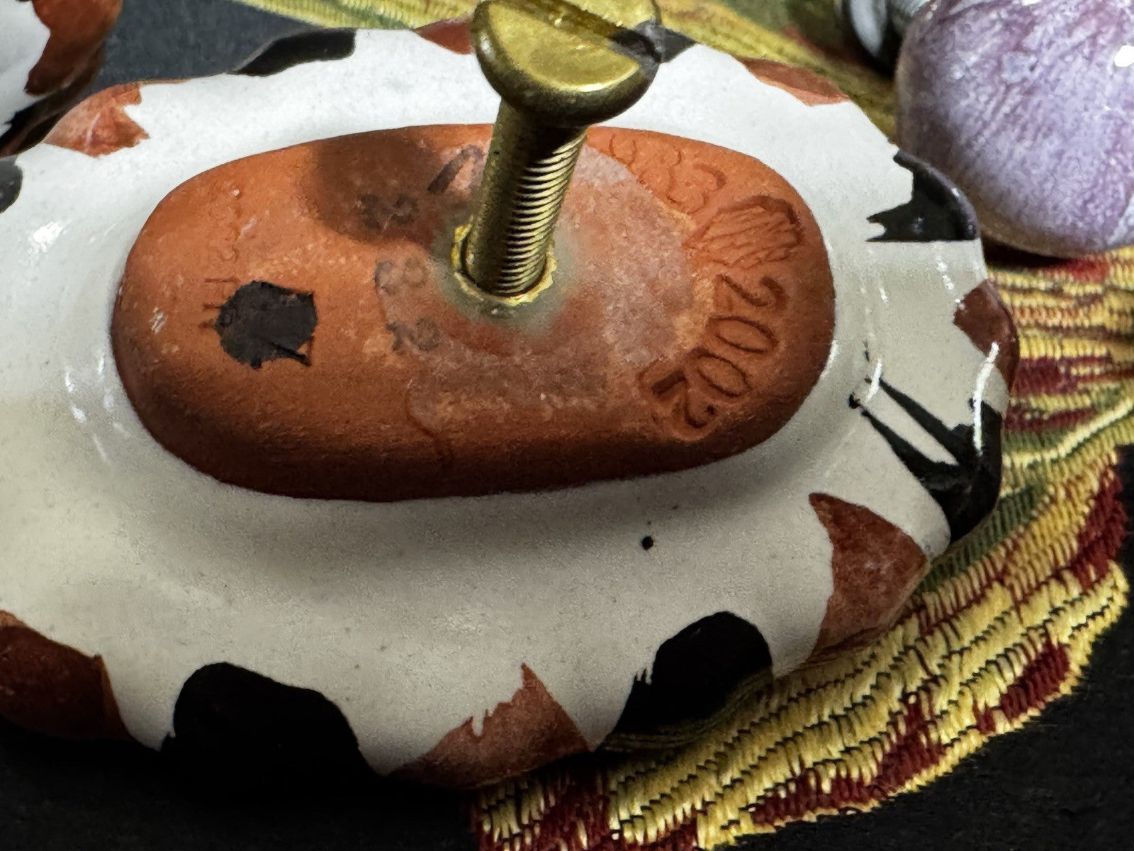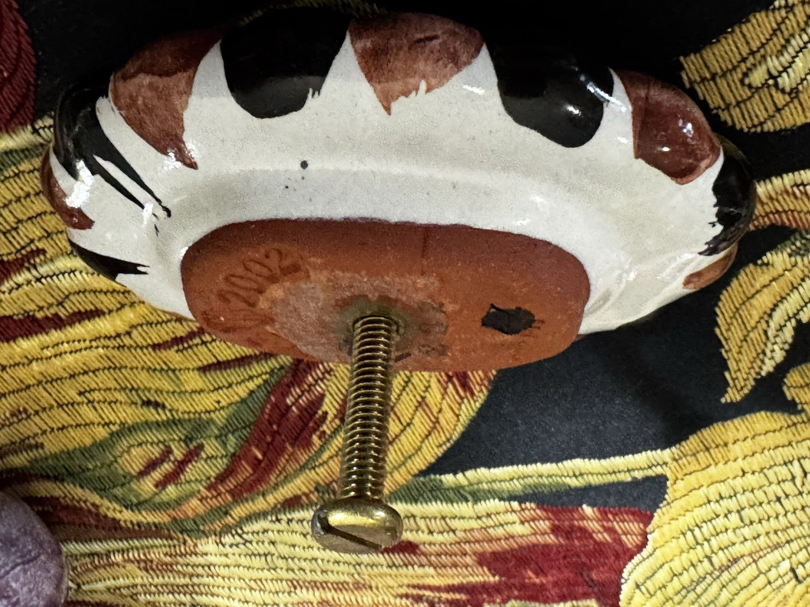 The MacKenzie Childs Ribbed Majolica Cabinet Pulls are a unique and decorative addition to any home. Made of ceramic and porcelain in the United States, these multi-color knobs have a ribbed oval style that adds a touch of originality to your cabinets. With a 3" width, 2" height, and 1.5" protrusion, these one-of-a-kind pulls are sure to make a statement in your kitchen or bathroom decor. Ideal for collectors or those looking to add a pop of color to their home, these cabinet pulls are a charming and stylish choice.