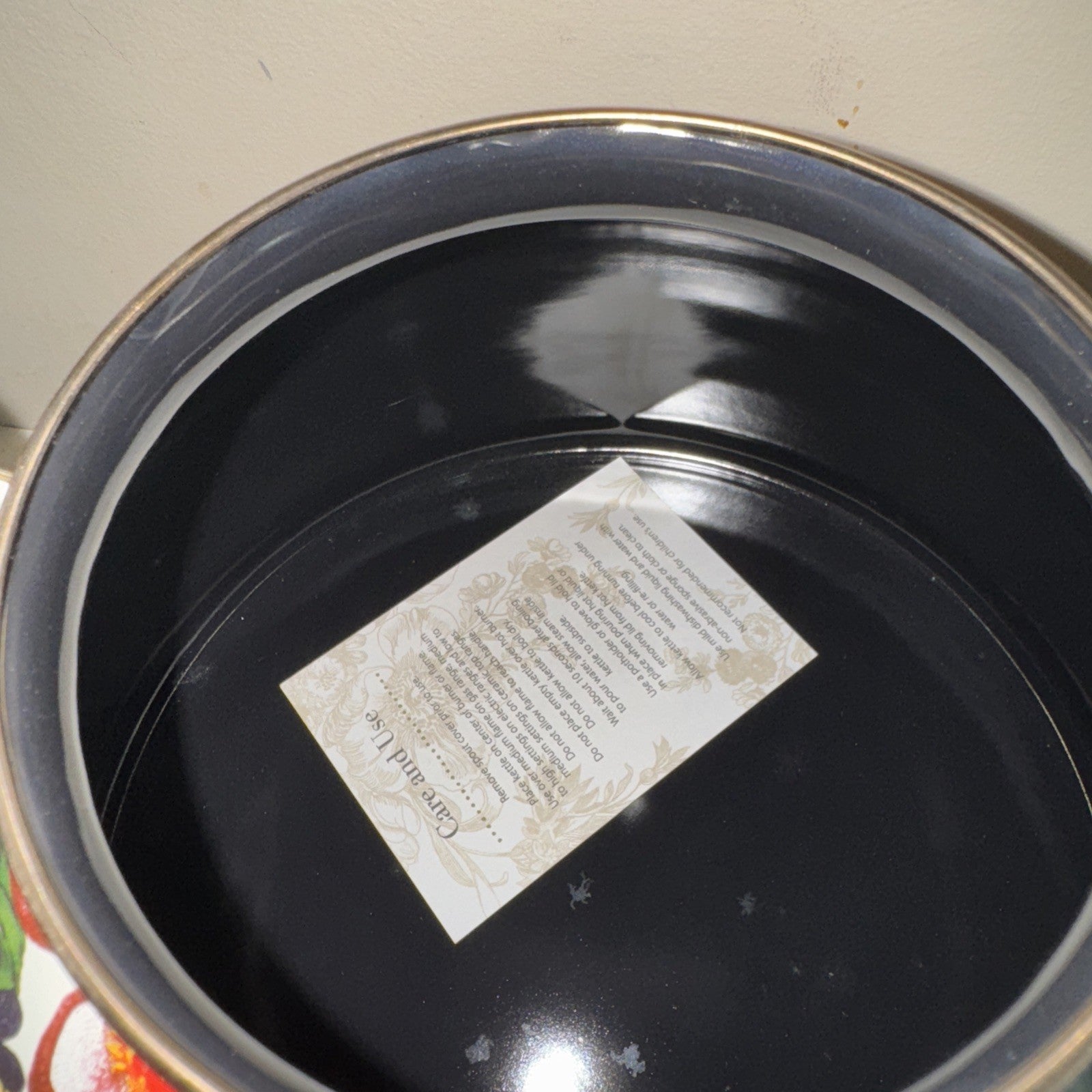 The Mackenzie Childs White Flower Market Tea Kettle With Bird Knob is a stylish and functional addition to any kitchen. This round, 3 quart stove top kettle features a floral enamel finish with a unique bird knob. With a modern retro design and easy clean features, this collectible piece is both decorative and practical. Made of enamel and sourced from Taiwan, this tea kettle is sure to add a touch of charm to your kitchen decor.