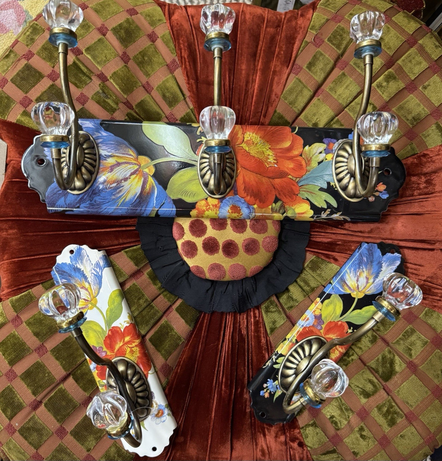Retired MacKenzie Childs Black Flower Market Enamel Double Wall Hook Blue Rings