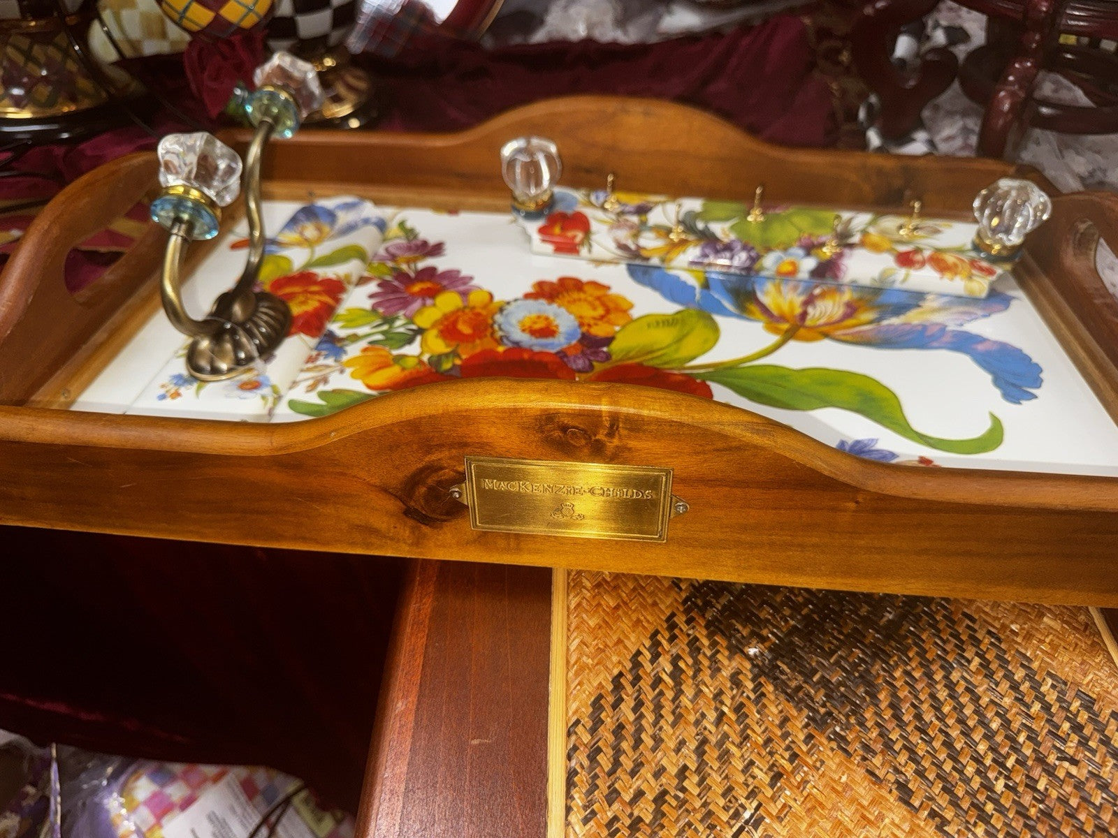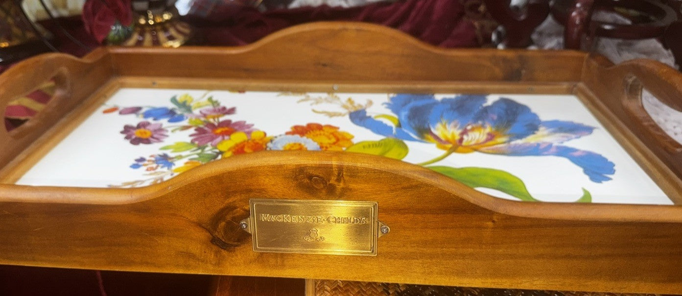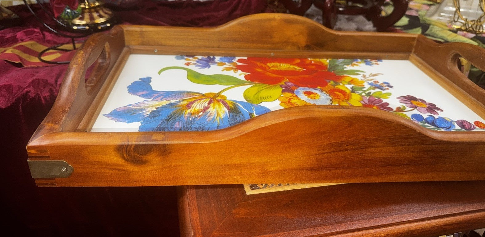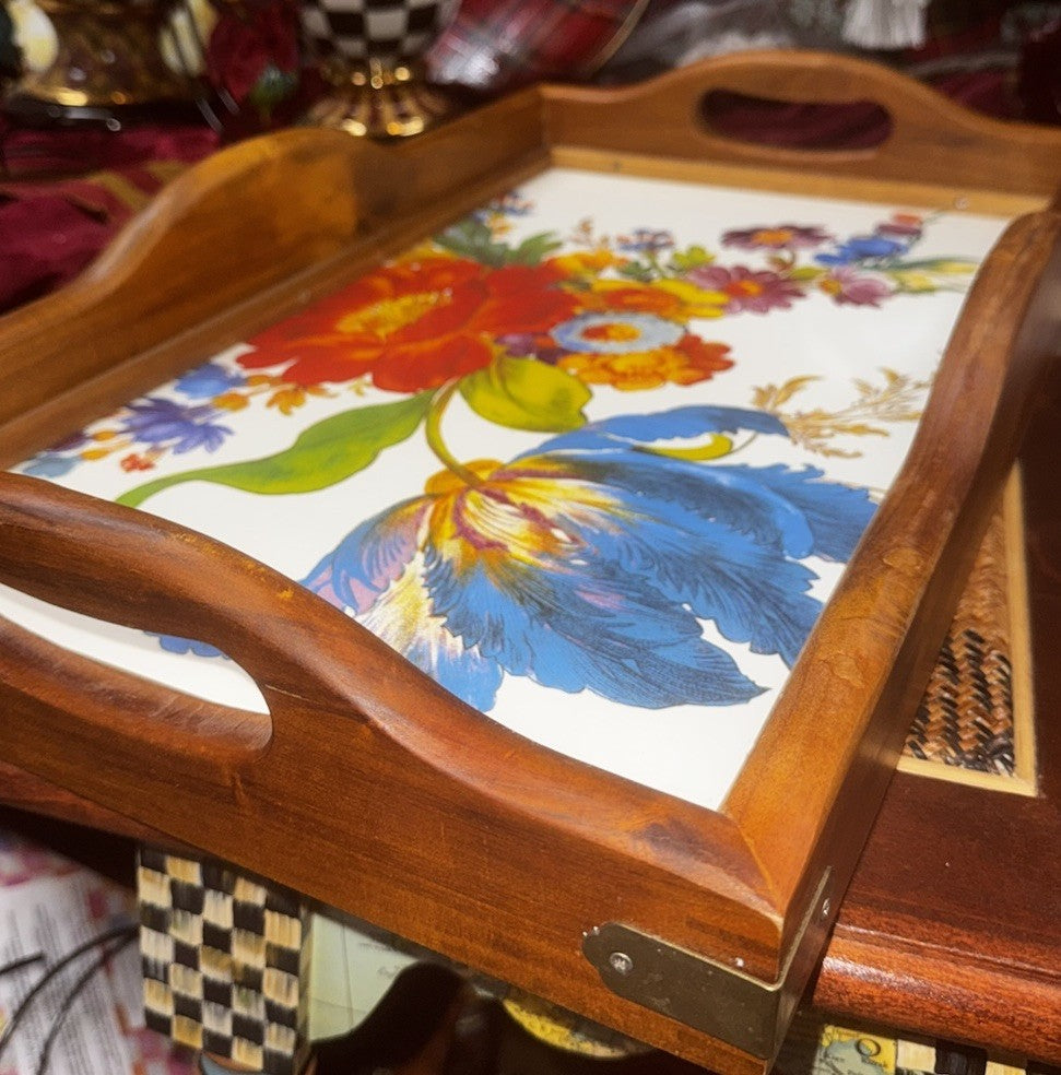 Heavy-gauge hand-glazed steel tray base with hand-painted white flower market , rimmed in Acacia wood.