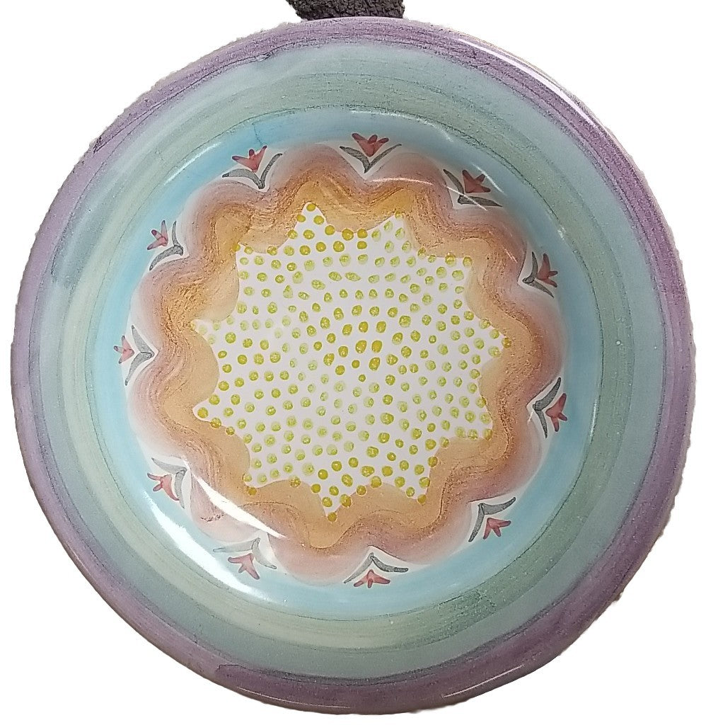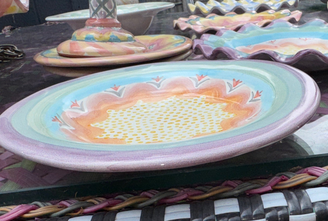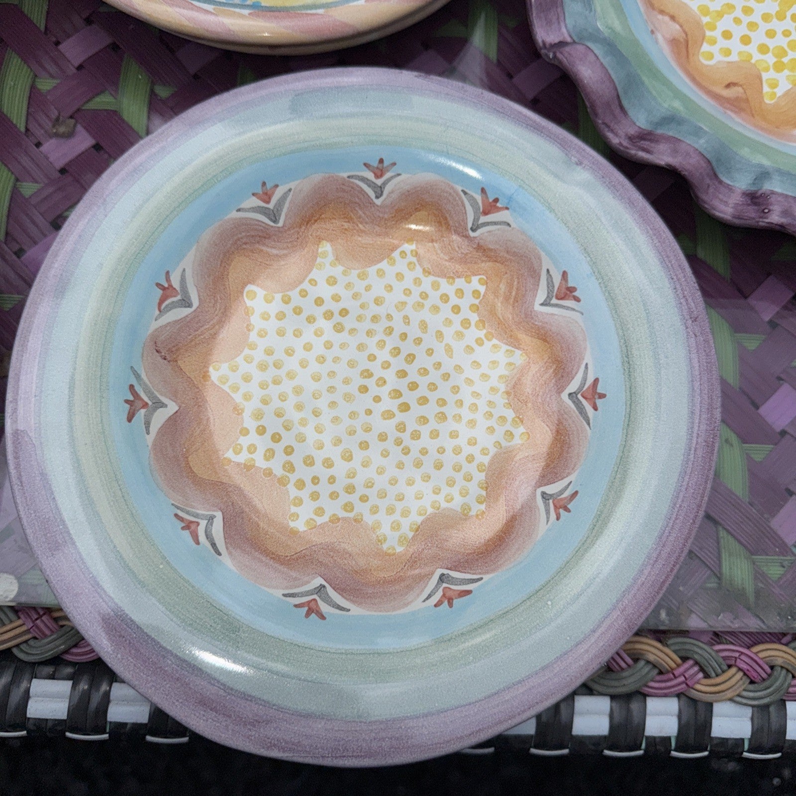 The MacKenzie-Childs Vintage Brittany Dessert Plate is an 8.5" pottery dish featuring a purple color and vintage design from 1991. This charming plate can be used as a dessert plate, salad plate, or side plate, adding a touch of retro elegance to any dining table. Made by the renowned brand MacKenzie-Childs, this collectible piece is perfect for serving up your favorite desserts or appetizers in style.