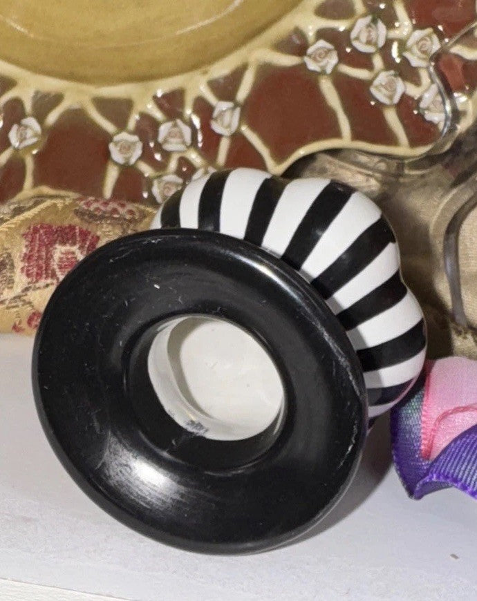 The Mackenzie Childs Courtly Stripe Made in Aurora Majolica Pottery Bud Vase Finial is a luxurious and elegant lighting accessory designed to add a touch of style to your home decor. Crafted from high-quality majolica pottery, this finial features a classic black, white, and gold color scheme that complements a variety of interior styles. At just 2.25 inches in height and width, this eye-catching piece is perfect for adding a touch of sophistication to your lamps, lighting fixtures, or ceiling fans.