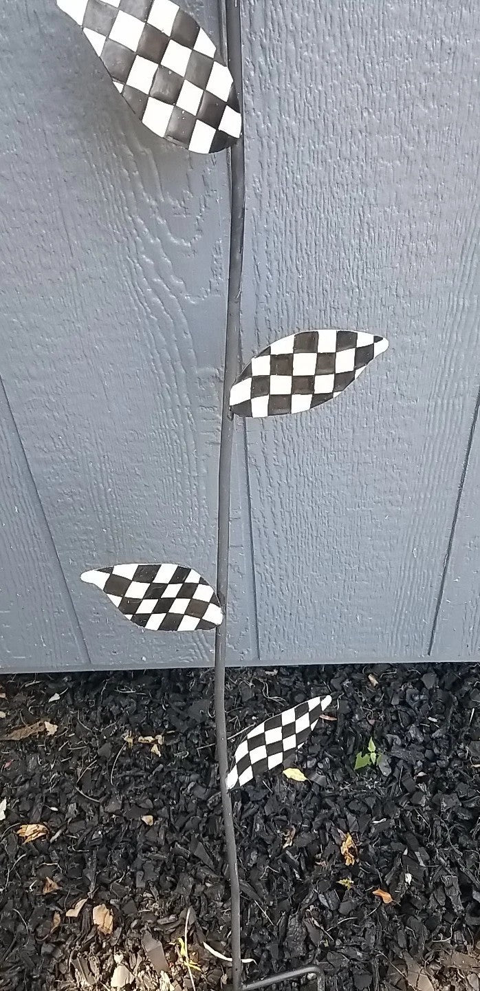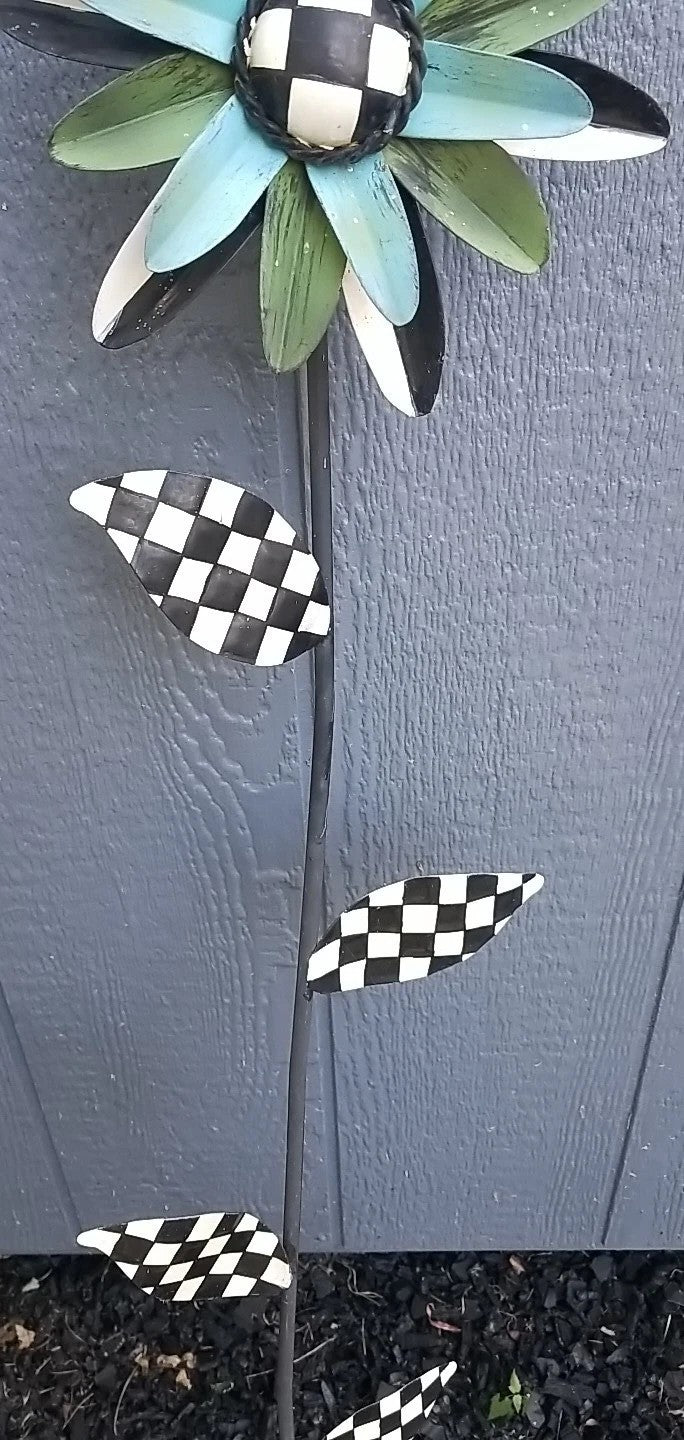 The MacKenzie-Childs Garden Metal Stake is a 45.5" tall flower-shaped garden decor piece in the Courtly Check retired pattern. Made of metal with a black color and checked pattern, this decorative item adds a touch of charm to any garden. With a design that includes a 42.5" length when fully extended and a 9" width, this stake is both functional and stylish for outdoor spaces.