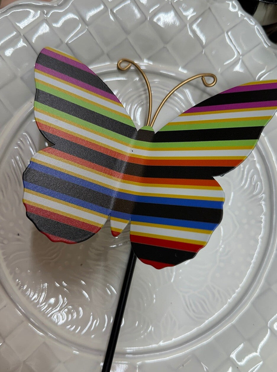 New McKenzie Childs hand-painted metal garden stake. Put in your potted Planters or in your garden for a nice accent. This item is super Charming. This item is new and is 17 in high. The butterfly is 6 in wide.