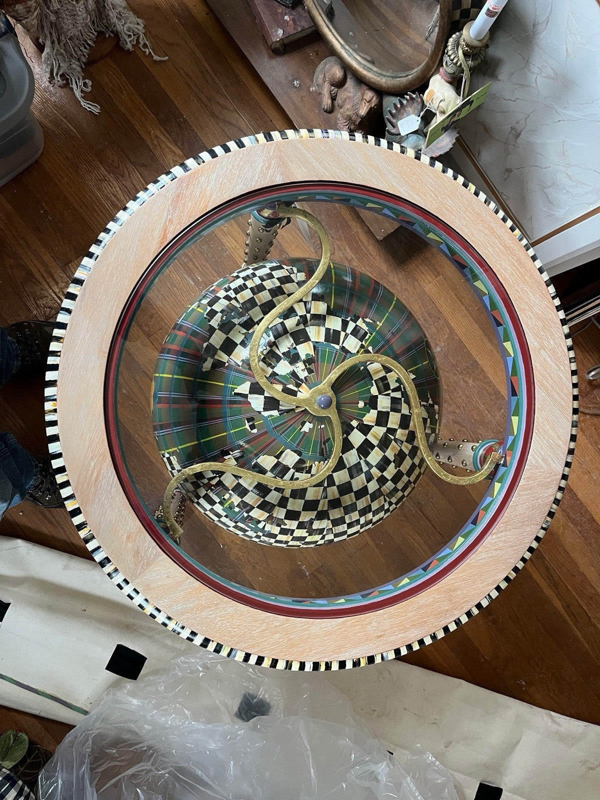 The table is perfect for indoor use only and is ideal for displaying decor items. With its brand name and unique design, this table is a true conversation starter. Don't miss your chance to own this very rare Mackenzie-Childs Platitudes Globe Side Table.