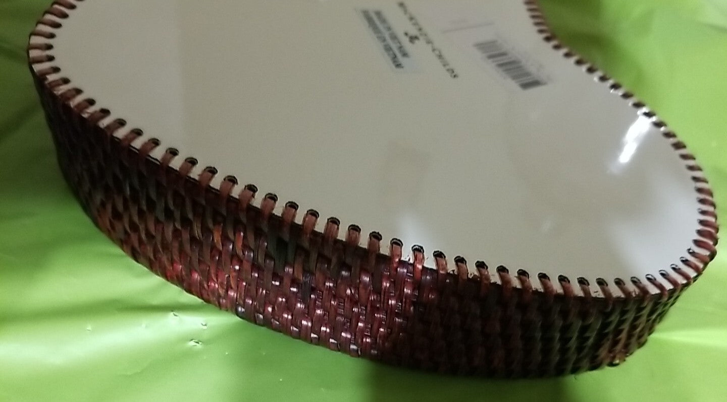 The tray features a unique rattan design that adds texture and depth, making it a truly special piece. Measuring 9 inches in width, it is the perfect size for serving drinks or displaying your favorite snacks. This original, licensed reproduction is made in Vietnam and is sure to impress. Add it to your collection today!