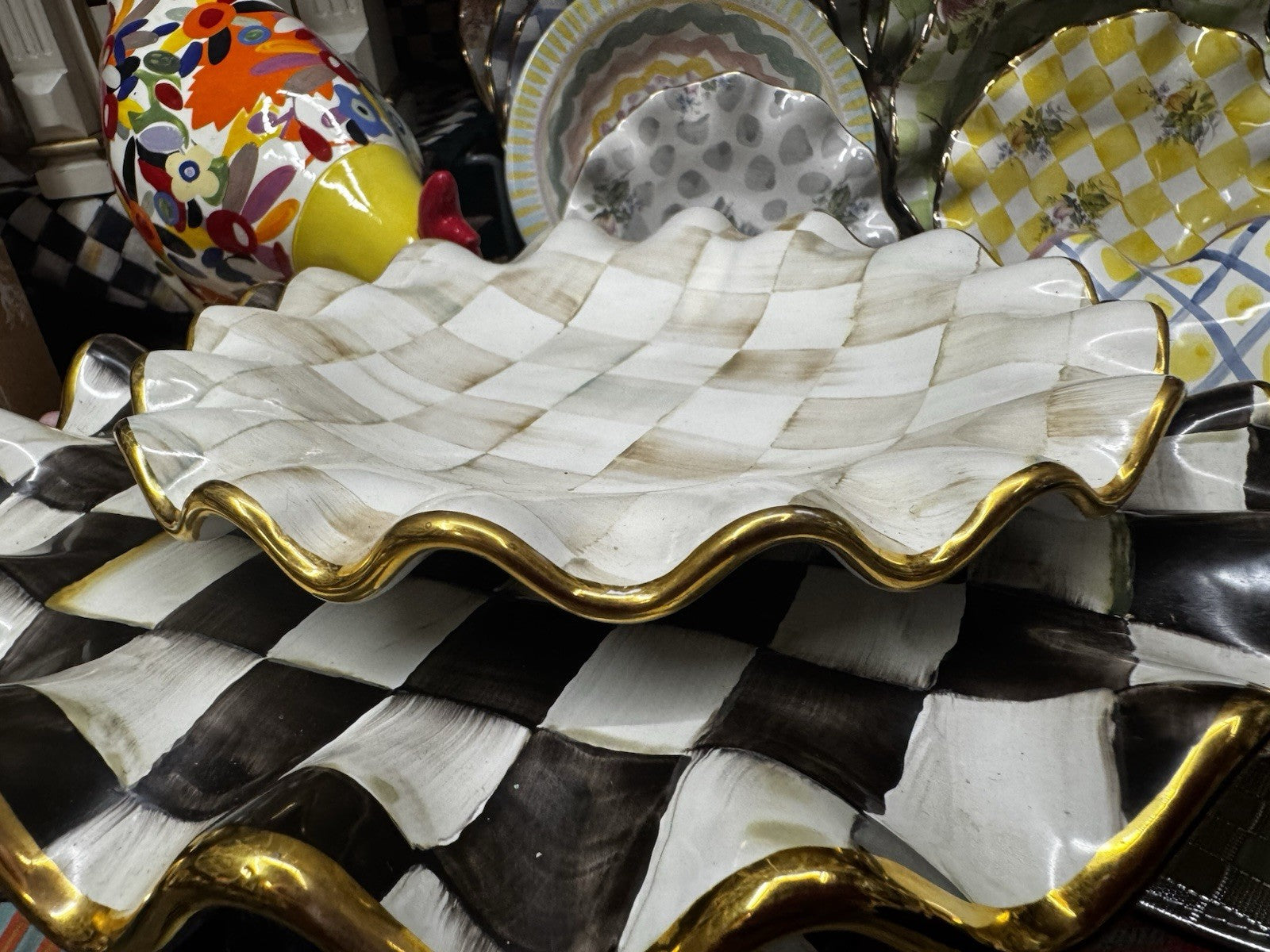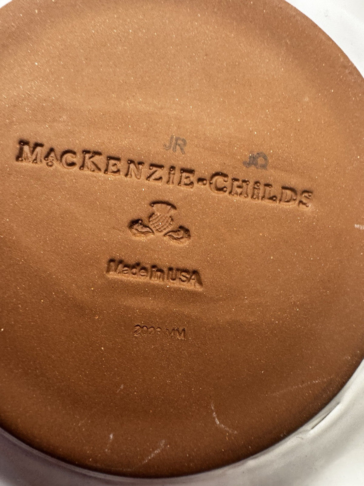 This listing is for a new Mackenzie Childs PARCHMENT CHECK CERAMIC FLUTED DESSERT PLATE. Handmade and hand-painted. Initials of the artisans and production date 2017 can be seen on the bottom of the plate.