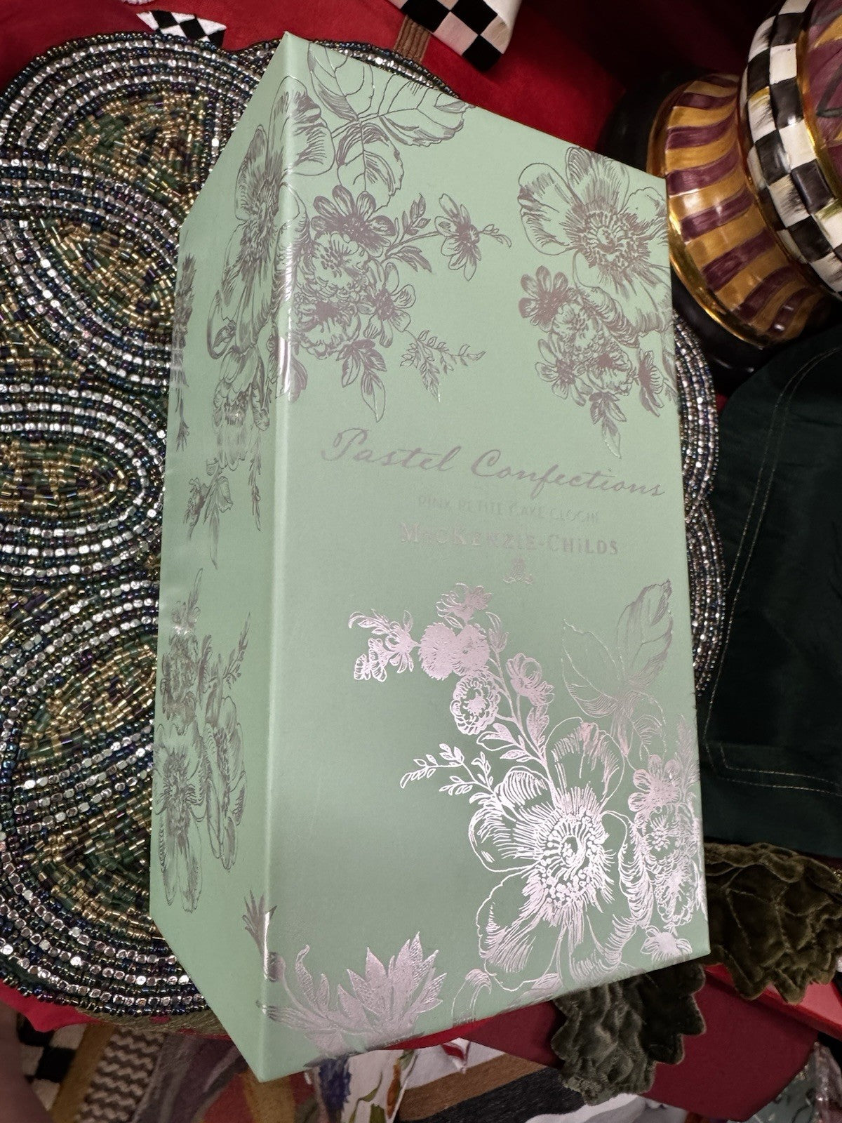 Matte gold with pastel pink, mint green & white designs