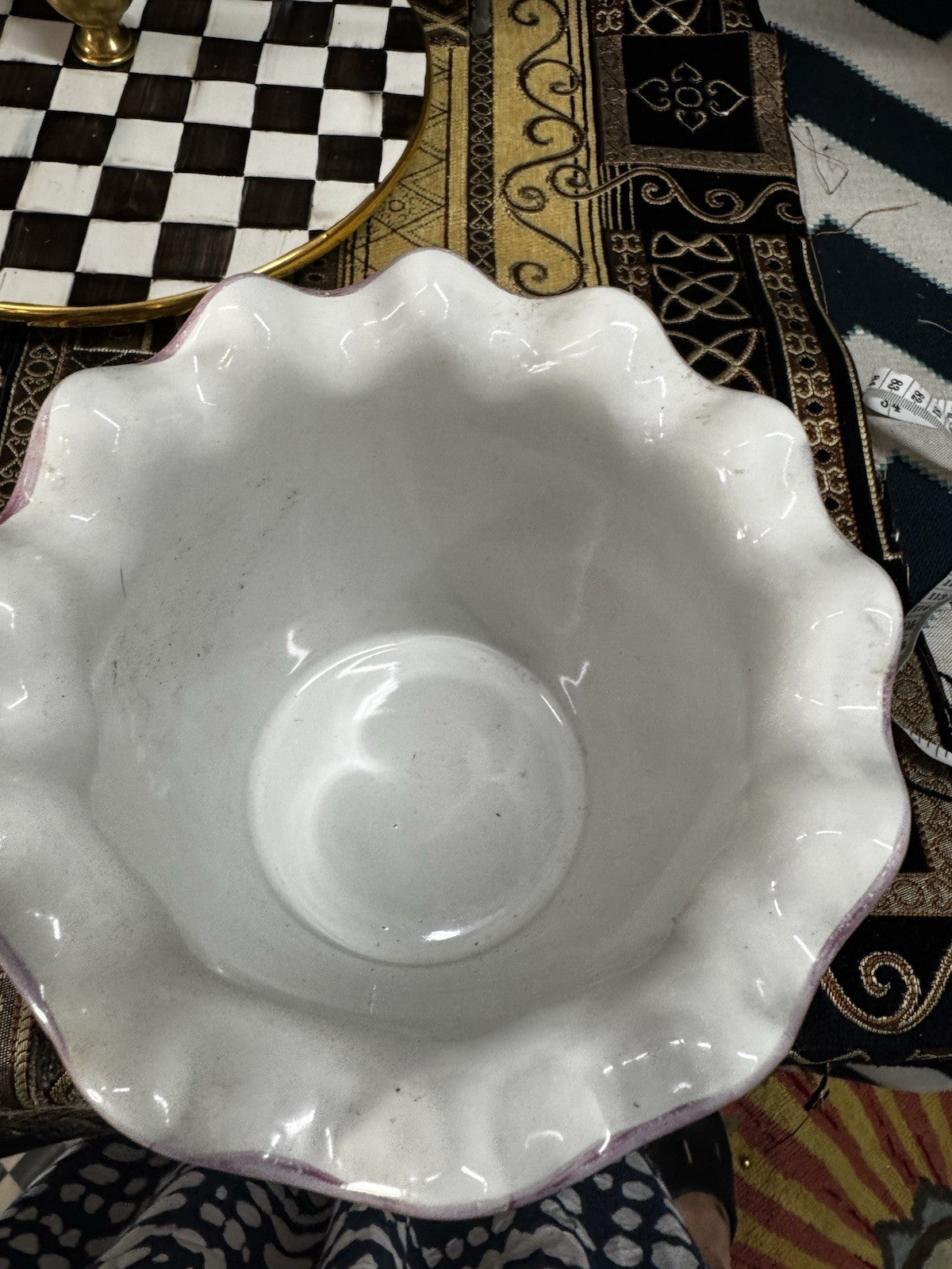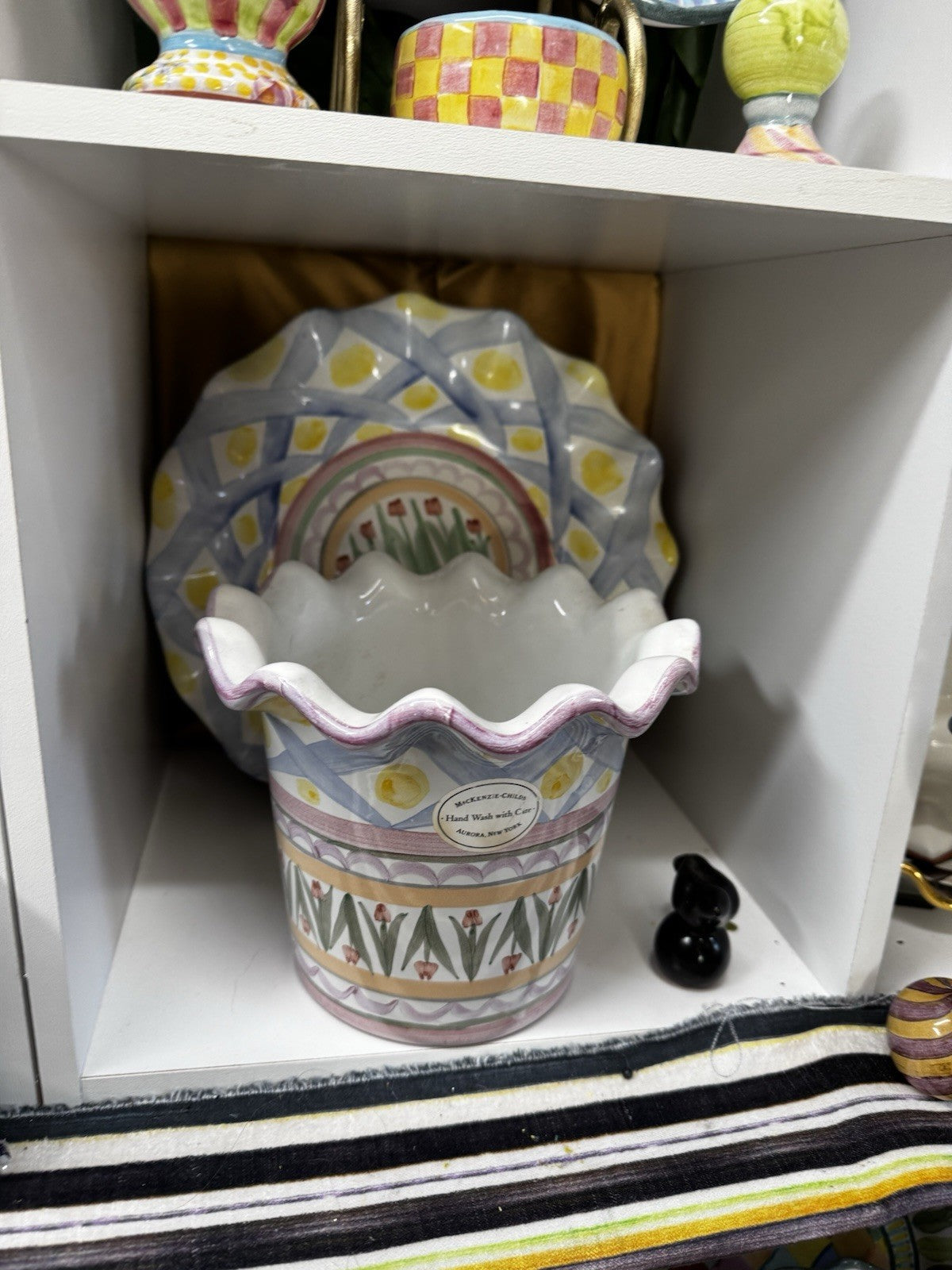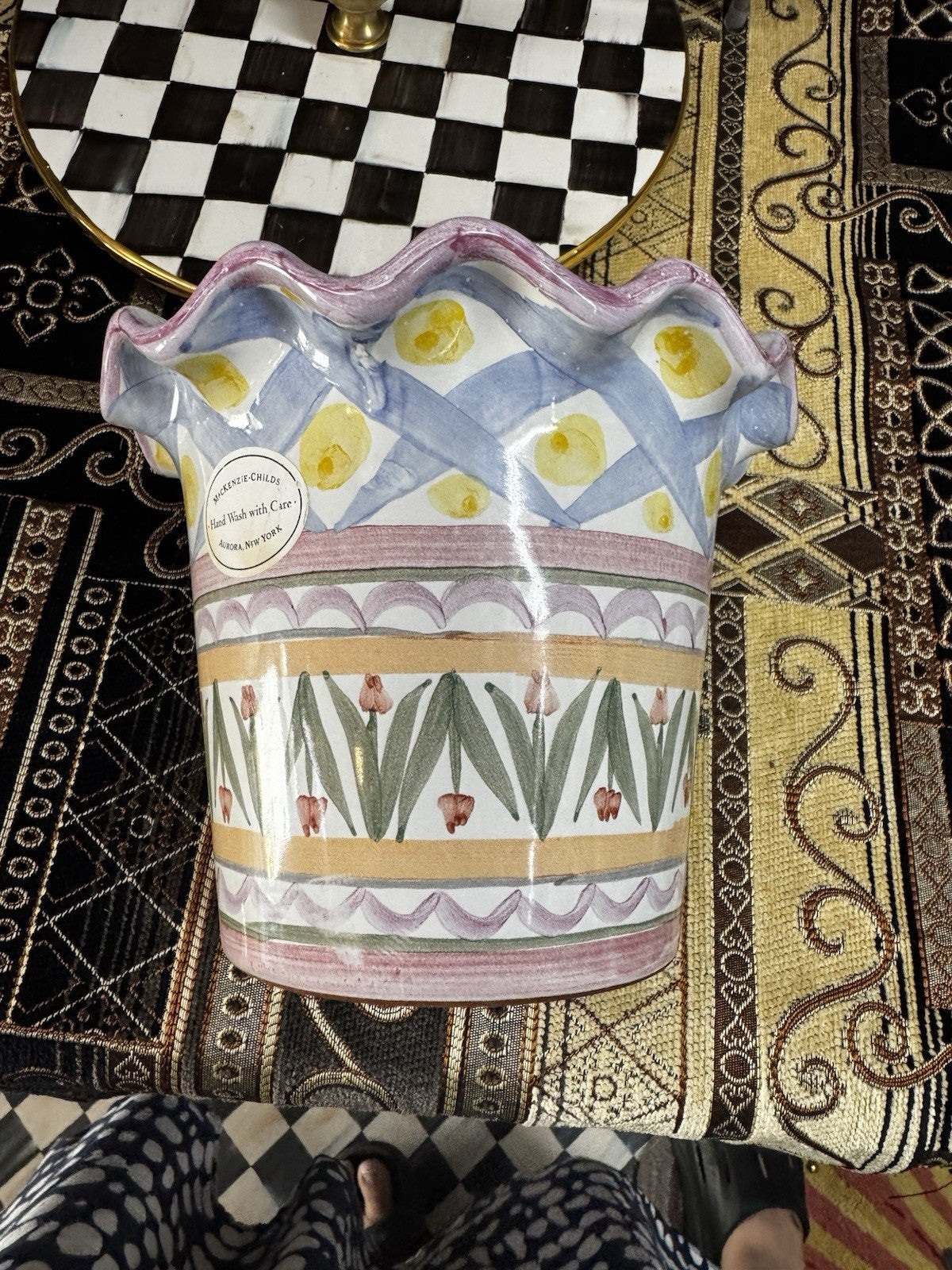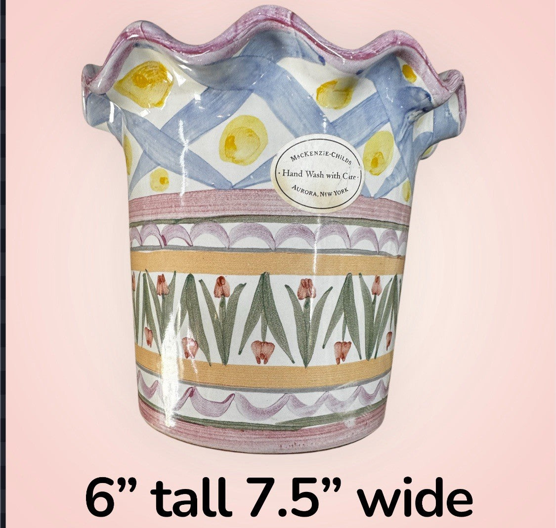 The Mackenzie Childs Fluted Ruffled Ceramic Planter Pot in the Taylor Aalsmeer pattern is a medium-sized decorative collectible featuring a multicolor glossy finish. Made of terracotta and ceramic, this planter is designed in the United States by the renowned brand Mackenzie Childs. With a weight of 5 lbs, this unique piece adds a touch of style to any home decor, showcasing the intricate Aalsmeer Taylor design. Perfect for displaying flowers or as a statement piece in any room, this planter is both functional and aesthetically pleasing.