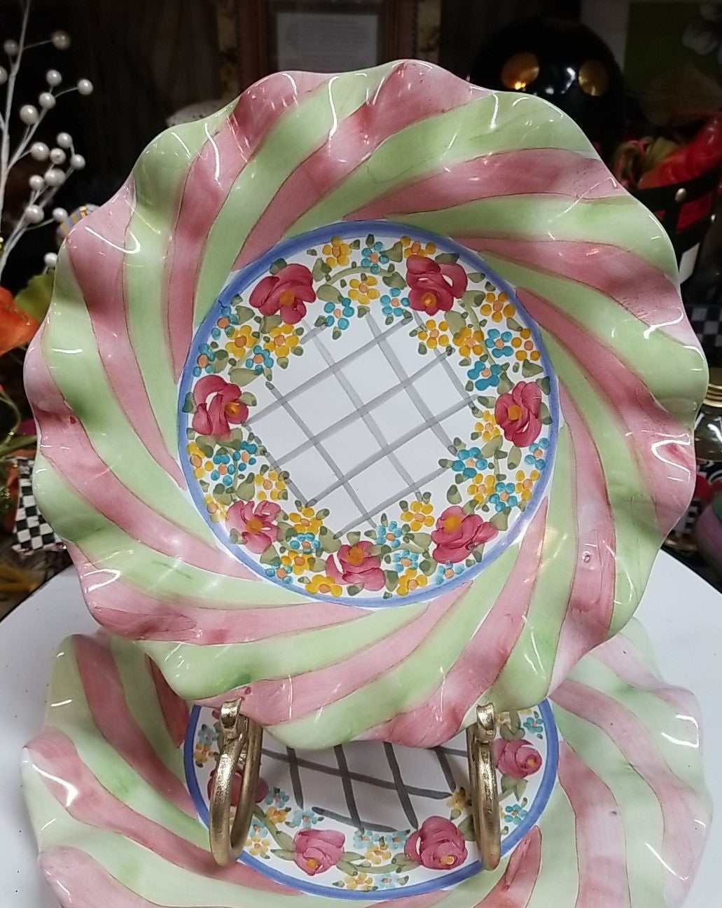 The MacKenzie Childs Taylor Glen Park Dessert Salad Plate is a beautifully crafted ceramic plate with a 9" diameter and a fluted design. The plate features the popular ridge pattern in the Glen Park color palette, giving it a unique and stylish look. Handmade with a glossy finish, this dessert plate is a perfect addition to any table setting for serving your favorite desserts. The MacKenzie-Childs brand ensures high-quality craftsmanship and attention to detail in this decorative and functional piece of dinnerware.