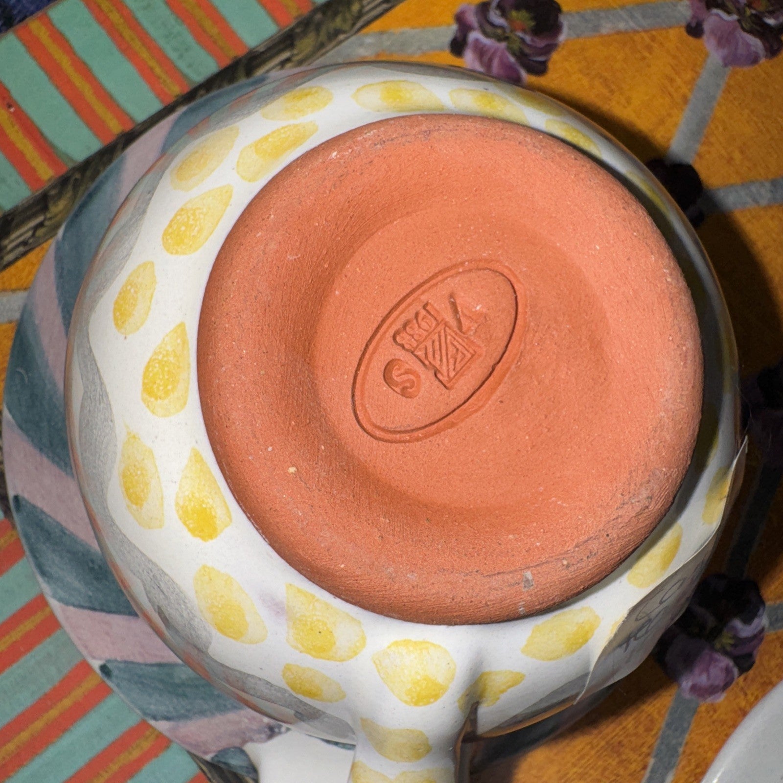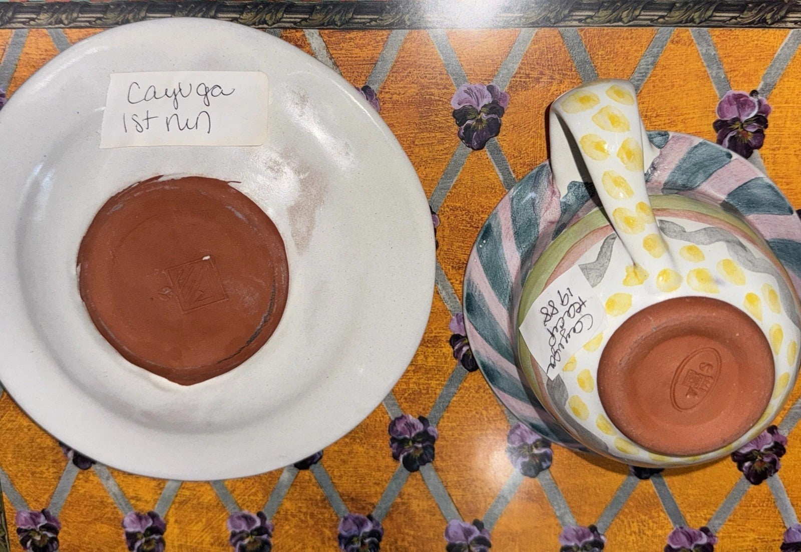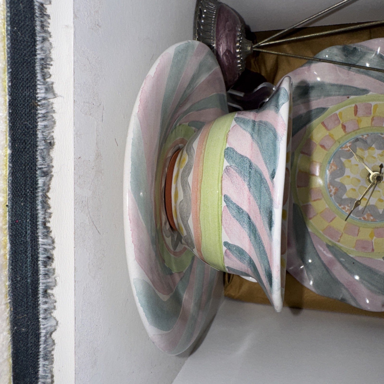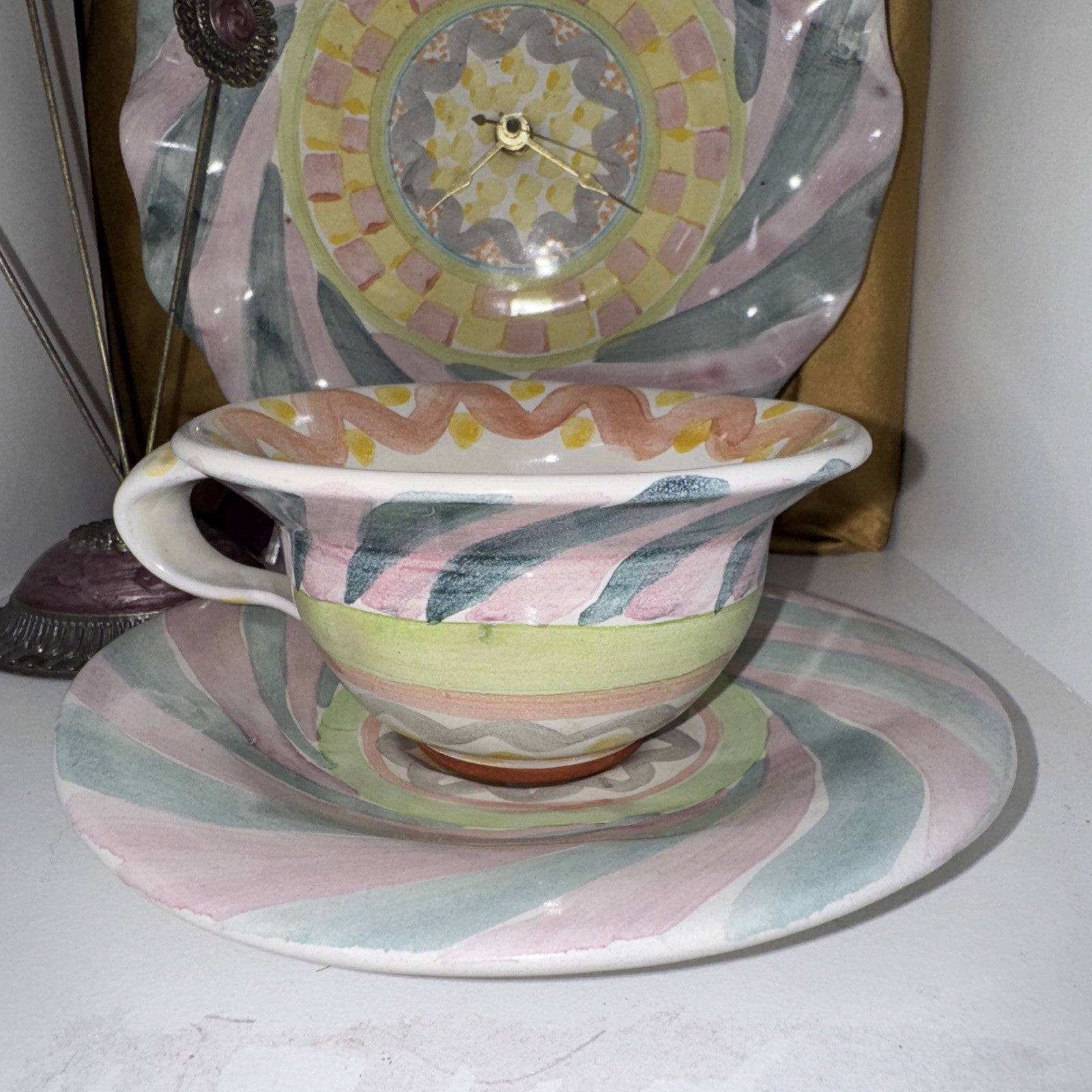 The Victoria & Richard Era Mackenzie Childs Taylor Cayuga Cup And Saucer 1988 is a collectible kitchen and home set from the renowned MacKenzie-Childs brand. Featuring a colorful Taylor Cayuga design, this set includes a vibrant saucer and cup that add a touch of whimsy to any dining experience. This vintage piece from 1988 is a must-have for collectors of unique and artistic dinnerware.
