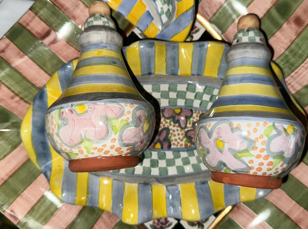 MacKenzie Childs Myrtle Salt and Pepper Shakers w Fluted Oval Plate - Ceramic