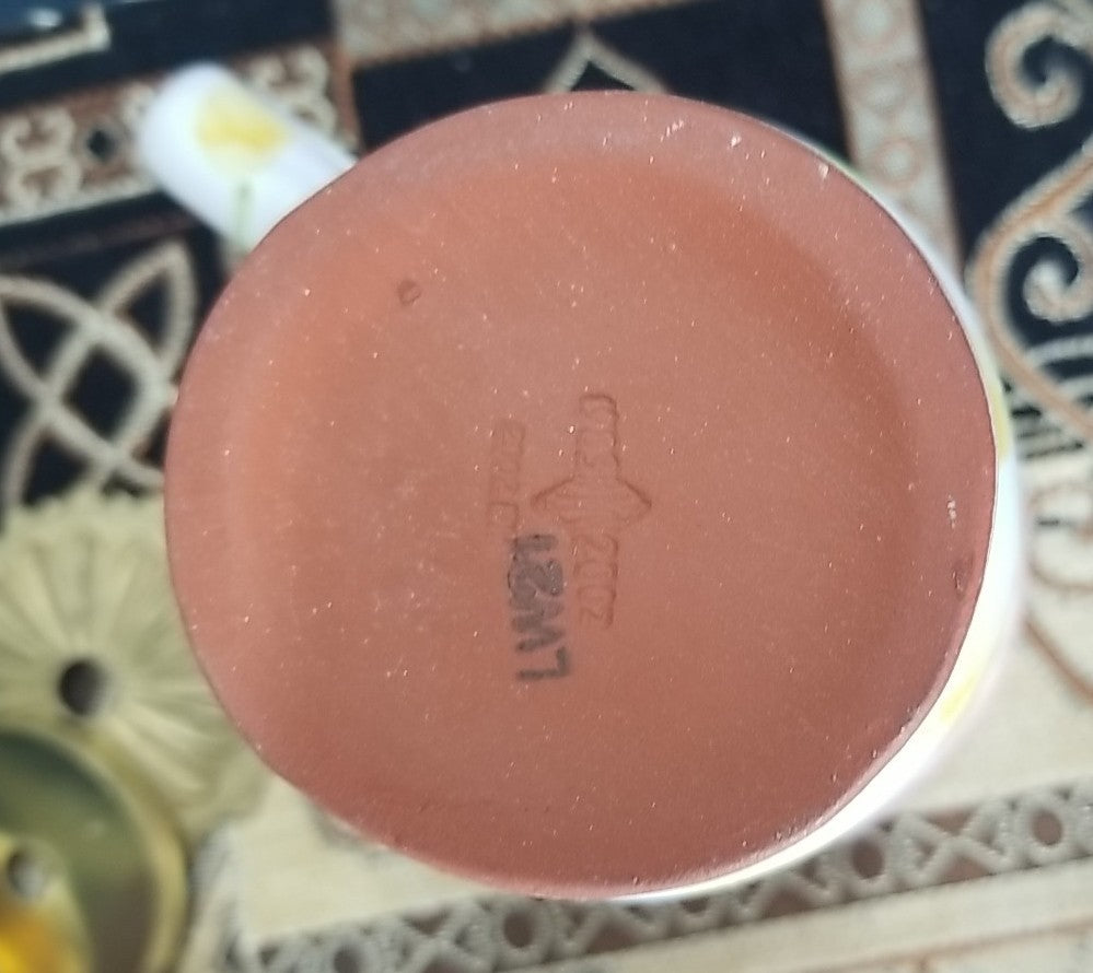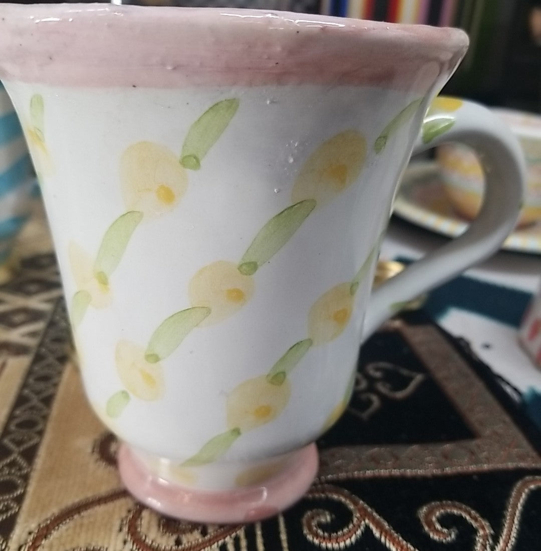 The MacKenzie Childs Wallcourt Fenwick Footed Mug is a 12 oz round ceramic and porcelain mug that is hand-painted in yellow. With a traditional design and a capacity for hot or cold beverages, this vintage piece is decorated with an abstract art theme. Handmade in the United States, this collectible mug is perfect for all occasions and features a handle for easy sipping. Ideal for unisex adults, this unique and original MacKenzie-Childs mug is a must-have for any kitchen or home collection.