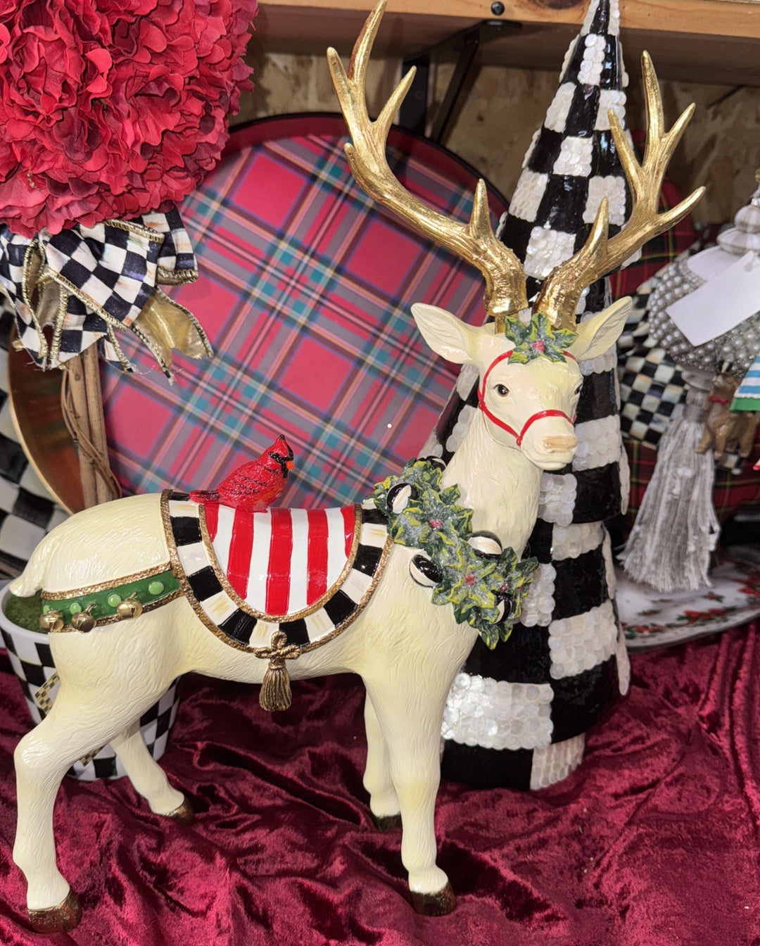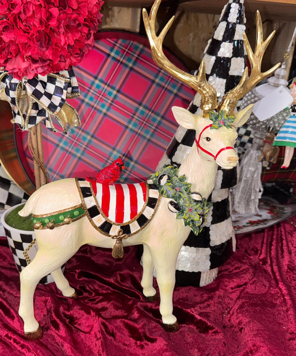 MacKenzie Childs Peppermint Standing Reindeer 11.5" x 4.5" With Cardinal-new